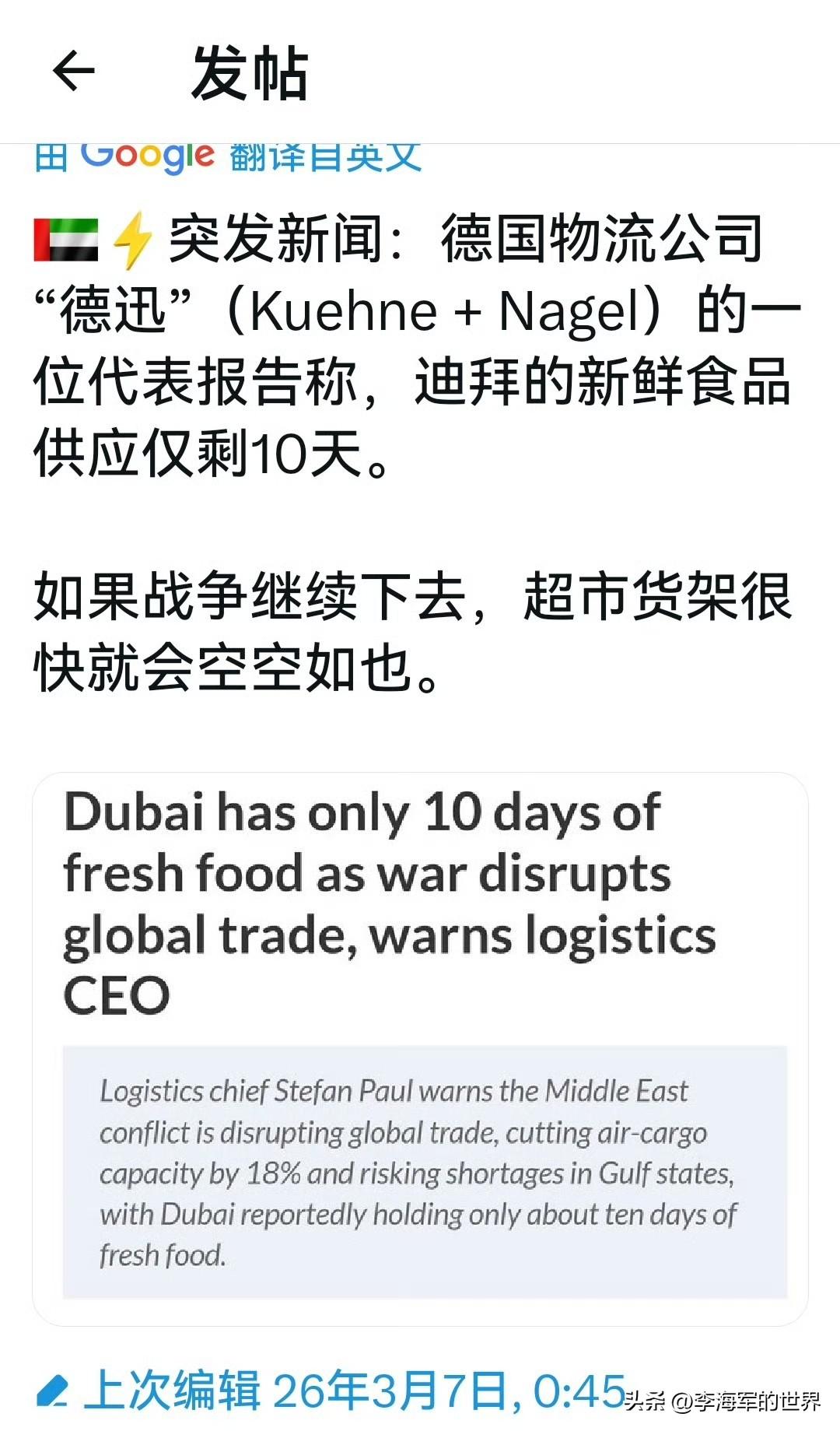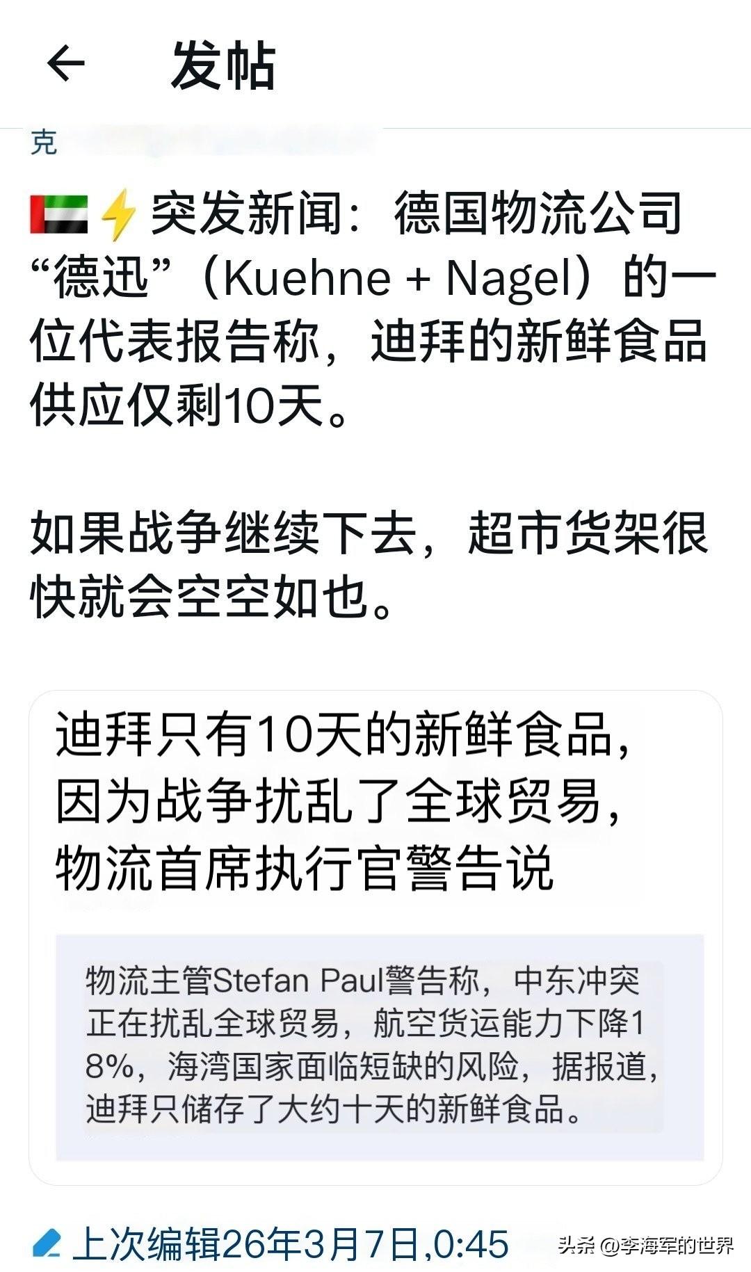 物流主管警告,迪拜只有大约10天的新鲜食品。意思就是这场冲突再继续下去,10天过后,迪拜市场可能没新鲜食品吃了。 其实不光迪拜一家,受此冲突影响,海湾国家大多如此。 众所周知,这些海湾国家的新鲜食品都是靠外进口。本国几乎不产,只要海外物流一断,食品供给立马告警。 不管你是什么人,土豪也罢,穷人也好,只要断水断粮,大家都是一个待遇。 这么看来,伊朗只要再坚持半个月,这些国家立马就会说人话。