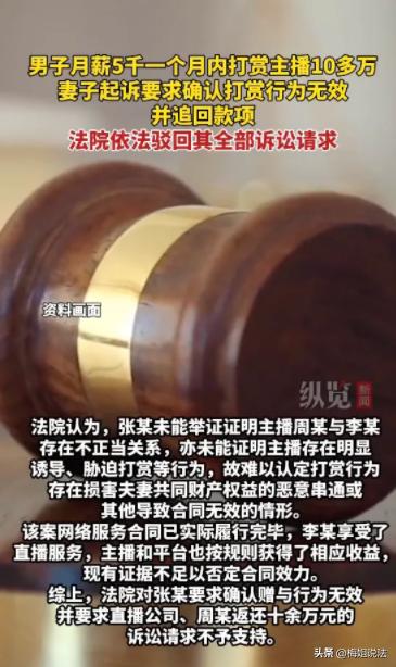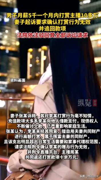 福州,小张一觉醒来,发现天都塌了。在她不知道的时候,她的丈夫小李竟然迷上了女主播,还为了女主播一掷千金,不到两个月的时间,小李竟然背着小张给女主播打赏10万多元,要知道,小李一个月的工资还不到5000元。如此巨大的支出,给本不富裕的家庭带来沉重的负担。因此,小张一怒之下,把直播平台和主播告上了法庭,小张表示,小李在平台上消费的那些钱,她完全不知道,平台和主播必须给她还钱。那么,小张能如愿吗? (消息来源:红星新闻,纵览新闻) 事情发生在2025年,为了更好地观看直播,小李注册了两个账号,随后小李就被直播间的女主播迷住了。 为了支持女主播的直播事业,也可能是为了获得女主播的青睐,在4月1日到5月21日,短短50余天的时间里,小李不只对一个直播间进行了打赏。 大概是每次充值的金额都不算很大,小李或许也没有意识到,在自己频繁地充值下,自己的存款早已经化成一份份礼物,流进了这些主播的直播间。 小李的工资不高,每个月到手不到5000元,很快,小李手里的存款就见底了。 可是,小李打赏女主播的欲望,并没有随着存款见底而消散,相反,此时小李完全上头了。他迫切地希望为这些女主播花钱,可是手里没钱了怎么办? 小李想到,自己和妻子小张还有共同的银行账户,那里面还存了不少钱,要动用那里面的钱吗? 小李很快就否决了这种想法,一旦动用共同账户里的存款,那么作为妻子的小张,看到自己如此频繁且大手大脚地花钱,一定会刨根究底。 如果小张知道这些钱都是为了女主播花掉的,她一定会阻止自己。 于是,小李心一横,干脆找朋友借钱打赏这些女主播。小李的人缘不错,还真找朋友借了一笔不小的钱。 而这些借来的钱,也在小李对直播的日益痴迷中,成为一串串数据,作为礼物,被送给了主播。 小李在直播间花钱如流水,50多天的时间,他打赏的金额就超过了十万元。 而这之中,她有一个最喜欢的主播,单是小李给这个主播的打赏,就超过了9万元。 尽管小李一再隐瞒,但小张终究还是察觉到小李的异常花销。 经过调查,她终于发现,在她不知道的时候,自己的丈夫竟然给主播打赏了那么多钱。 这让小张异常生气,要知道,小李一个月的工资还不到5000,就算每个月不吃不喝全都能存起来,十万元也要存近两年。 但钱都已经花出去了,打骂小李也无济于事,当务之急,还是想办法要回这笔钱。 小张想着,这些打赏的钱应该属于夫妻共同财产,小李没有经过自己的同意,就私自打赏给主播,小张认为,作为小李的妻子,自己有权找平台或者主播追回这笔打赏。 小张的行动力很强,很快,她就起诉让平台退回这笔钱。在小张看来,小李挥霍夫妻共同财产,完全是不占理的,因此,自己是有权利追回这些打赏的。 然而,最终法院却判定小张败诉。 也就是说,她无法拿回那10多万元。这又是为什么呢? 《民法典》第1062条,夫妻在婚姻关系存续期间所得的工资、奖金、劳务报酬等,为夫妻共同财产,而夫妻对共同财产,有平等的处理权。 尽管小李累积打赏了10多万元,然而,小李每一次打赏的金额都不算大。 在50多天的时间里,小李每天都会打赏一些,每一笔单独的消费都不算大,这样一来,完全可以当作日常家庭开销。 而针对这样的小额消费,小李和小张拥有平等的处理权,小李每一次充值消费,都不需要取得小张的支持。 既然每一笔小额消费小李都能够单独决定,合理合法,那么即便这些小额消费累计起来金额过大,小张也不能否决这些消费。 至于小张对平台的控诉,也是无稽之谈。对于用户体量庞大的直播平台,它不可能去审核每一个消费者,每一笔充值的具体来源。 给女主播大额打赏虽然引人遐想,但说到底,这也只是一种为自己的爱好买单的消费行为。不论小李对主播有多痴迷,但双方终究只是消费者和提供服务者的关系。 主播在直播间是聊天也好,还是唱歌跳舞也罢,这是她给观众提供的服务,她没有强迫或者诱导小李,必须为自己提供的服务买单。 更重要的是,小李不是小孩子,所做的一切能用小孩子不懂事来解释。他早已经成年,甚至已经结了婚,他有自己的判断,有完全民事行为能力。 这十来万块钱,他没被骗,没被抢,花出去就是花出去了,不可能因为他或者他的妻子后悔了,就找别人要回来。 法院之所以驳回了小张的诉求,也正是如此,成年人总是需要为自己的行为负责的。 那么,对于这件事,大家有什么看法呢?欢迎留言讨论。