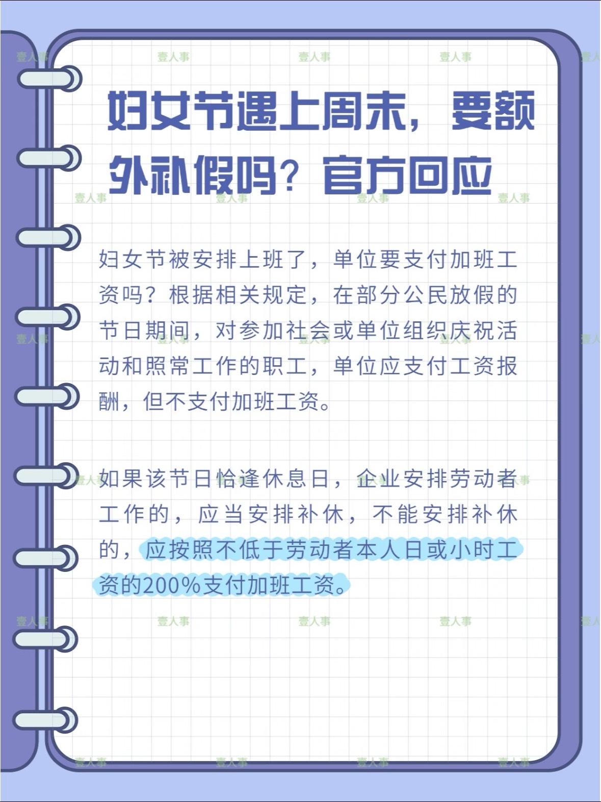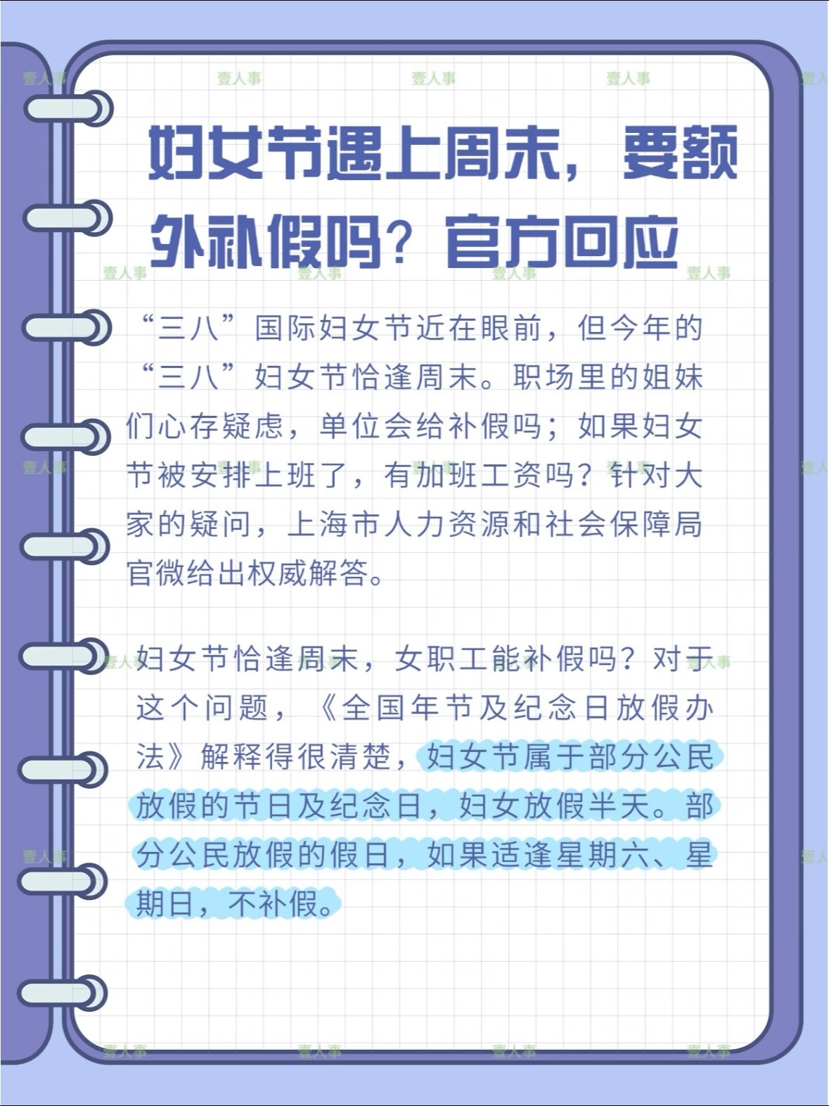 妇女节 放假先预祝咱们女生在自己的节日快乐~妇女节的假期赶上周末就没了,所以评论区有女粉说一下有没有提前半天放的?不过如果当天还有在上班的姐妹们,法定节假日规定的双倍加班工资记得要拿!