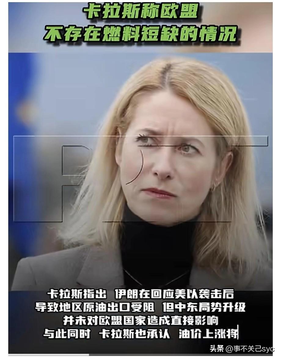 3月5日,据塔斯社报道,欧盟外交与安全政策高级代表卡拉斯声称,欧盟既不依赖波斯湾国家的石油供应,也无燃料短缺的情况,因此欧盟市场目前没有理由感到恐慌。 她表示,尽管伊朗在回应美以袭击后导致地区原油出口受阻,但中东局势升级并未对欧盟国家造成直接影响。 卡拉斯关于“中东局势不影响欧盟能源”的表态,显然罔顾事实,强打精神说硬话。目的在于安抚市场、稳定民心,是“战略镇定剂”。虽然欧盟的总体石油库存暂时无虞,但在关键领域和战略层面,实则暗藏严重隐忧。 卡拉斯声称“不恐慌”,其底气主要源于两方面: 一是储备充足,欧盟确实备有“存货”。目前成员国持有的战略石油储备可满足90天的消费量,且国际能源署(IEA)还有超过10亿桶的紧急储备。在短期内,这确实是抵御供应中断的“压舱石”。 二是依赖度低,从总量上看,欧盟从海湾地区进口的石油仅占总量的约8%,液化天然气(LNG)进口也仅9%来自卡塔尔。整体依赖度看起来并不致命。 虽然不致命,但也存在不可忽略的隐忧。在柴油和航空煤油这类特定油品上,欧盟有高达40%的进口依赖海湾国家。一旦断供,可能会导致物流卡车、航空运输等关键行业的燃料短缺,这并非总量储备能简单解决的。 霍尔木兹海峡承担着全球五分之一的石油运输。只要这里受阻,全球油价就会飙升。即使欧盟不直接买中东油,也必须按飙升的国际市场价格购买其他地区的原油,这会直接推高输入性通胀风险。 地缘政治的“连带效应”,卡拉斯其实在另一场合承认了真正的担忧:油价上涨会增加俄罗斯的战争收入;同时,中东战事正在“吸走”原本要提供给乌克兰的防空武器和情报资源。这才是对欧盟安全利益的长远且重大的打击。 卡拉斯自话,是宽慰自己,也是安抚人心。她的发言是可以说一次精心设计的危机沟通: 告诉民众“暖气不会停,大家别慌”,避免恐慌性抢购引发人为危机。 同时暗示美国及中东盟友,“别指望我们会轻易动用战略储备来帮你们平抑油价”,保留政策主动权。