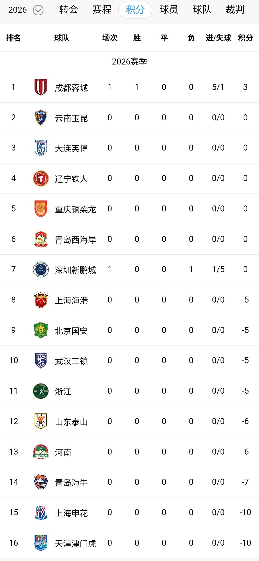 成都蓉城只踢了一场比赛,已经领先申花13分,领先山东9分,领先国安和海港8分,在争冠军团中匹马领先。 中超揭幕战正式打响,成都蓉城5-1主场大胜十人新鹏城。 现场球迷达到41219人,气氛非常热烈。蓉城今天的5个进球全部来自传中球。