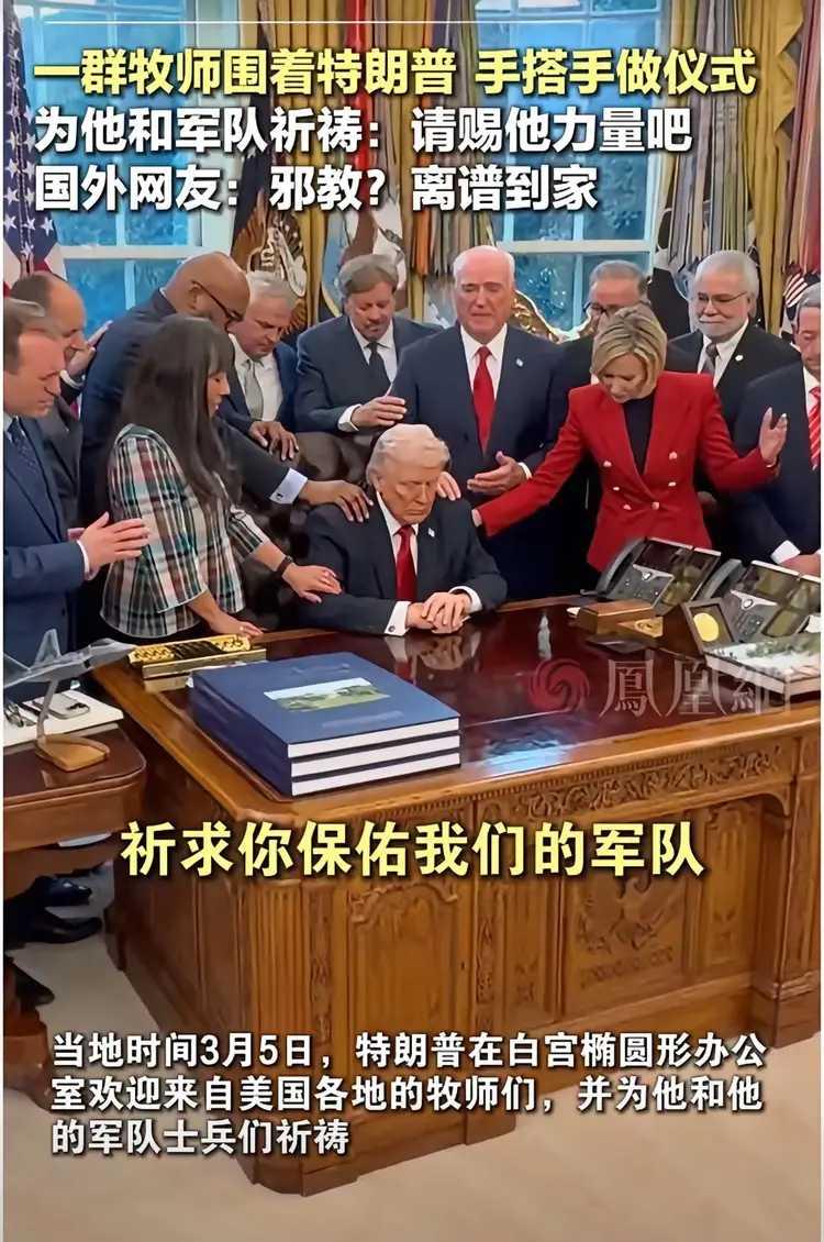 无所不能的懂王,原来也是依靠神赐的力量。 特朗普:天主保佑我们,阿门。 牧师:无所不在的神,请赐于我们伟大总统力量吧,阿门!