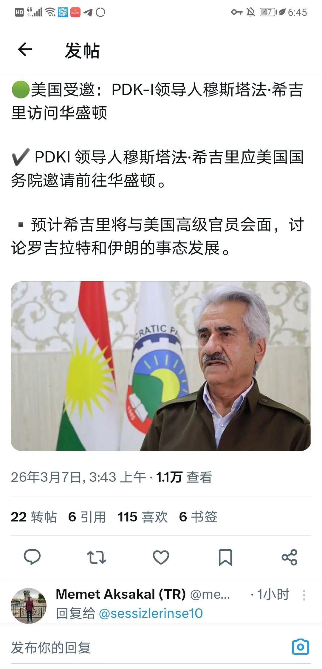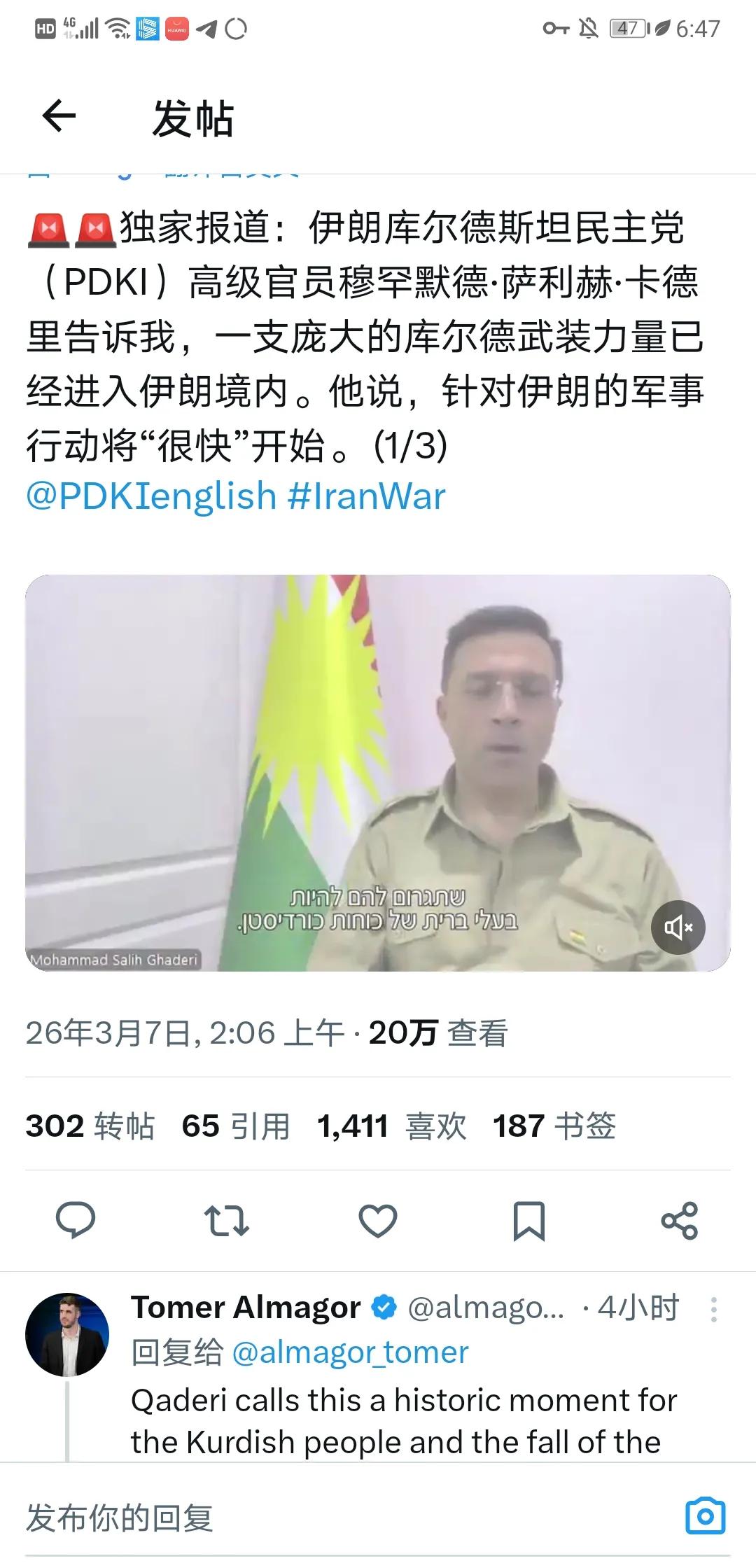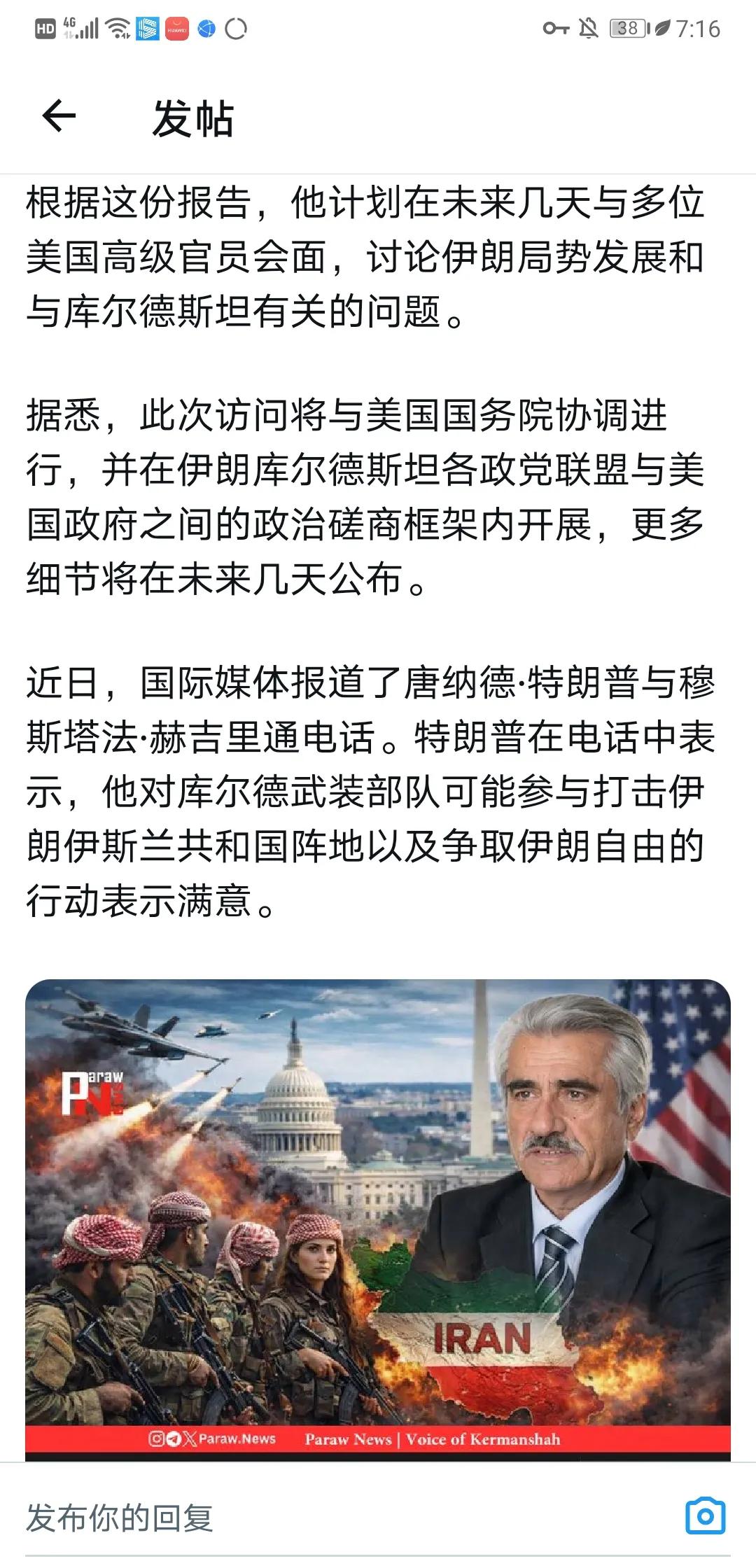 库尔德民主党主席法里希即将访美。该党是最坚决支持美国的伊朗库尔人组织。另据报道,该党高级官员卡德里接受尔以色列电台的采访时声称:他们已在伊朗境内布置大量军队,并即将对伊军展开行动。 伊军已经在打击库尔德军队。 伊朗叛徒