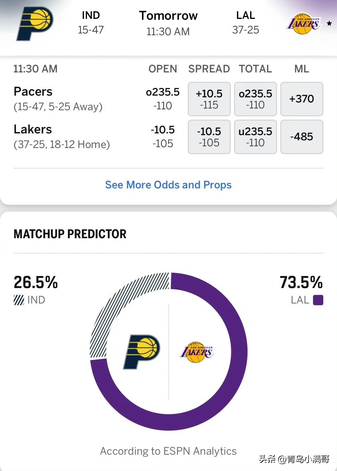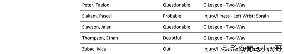 步行者vs湖人比赛预告!!!詹姆斯和艾顿因伤缺席对阵步行者! 北京时间3月7日,湖人将坐镇主场迎战印第安纳步行者队,背靠背作战的他们昨天不敌掘金,三连胜被终结了,而步行者这边已经遭遇了七连败,双方实力悬殊,主场作战的湖人有望轻取步行者,一起来看下比赛预告吧。 湖人伤病情况: 詹姆斯昨天在比赛最后时刻左手肘挫伤、艾顿左膝突发酸痛、克勒贝尔腰部拉伤,他们都确定将缺席本场比赛。 步行者伤病情况: 步行者这边就更惨了,哈利伯顿、弗菲赛季报销,祖巴茨遭遇脚踝伤病确定不打,而西亚卡姆、内史密斯、内姆哈德都是大概率出战比赛。 目前根据ESPN预测结果来看,湖人以超过七成的胜率被非常看好能够拿下本场比赛,而主场作战的他们也给出了-10.5的指数数据,看来步行者八连败是没跑了。天南地北大拜年 湖人 詹姆斯 步行者 nba 步行者
