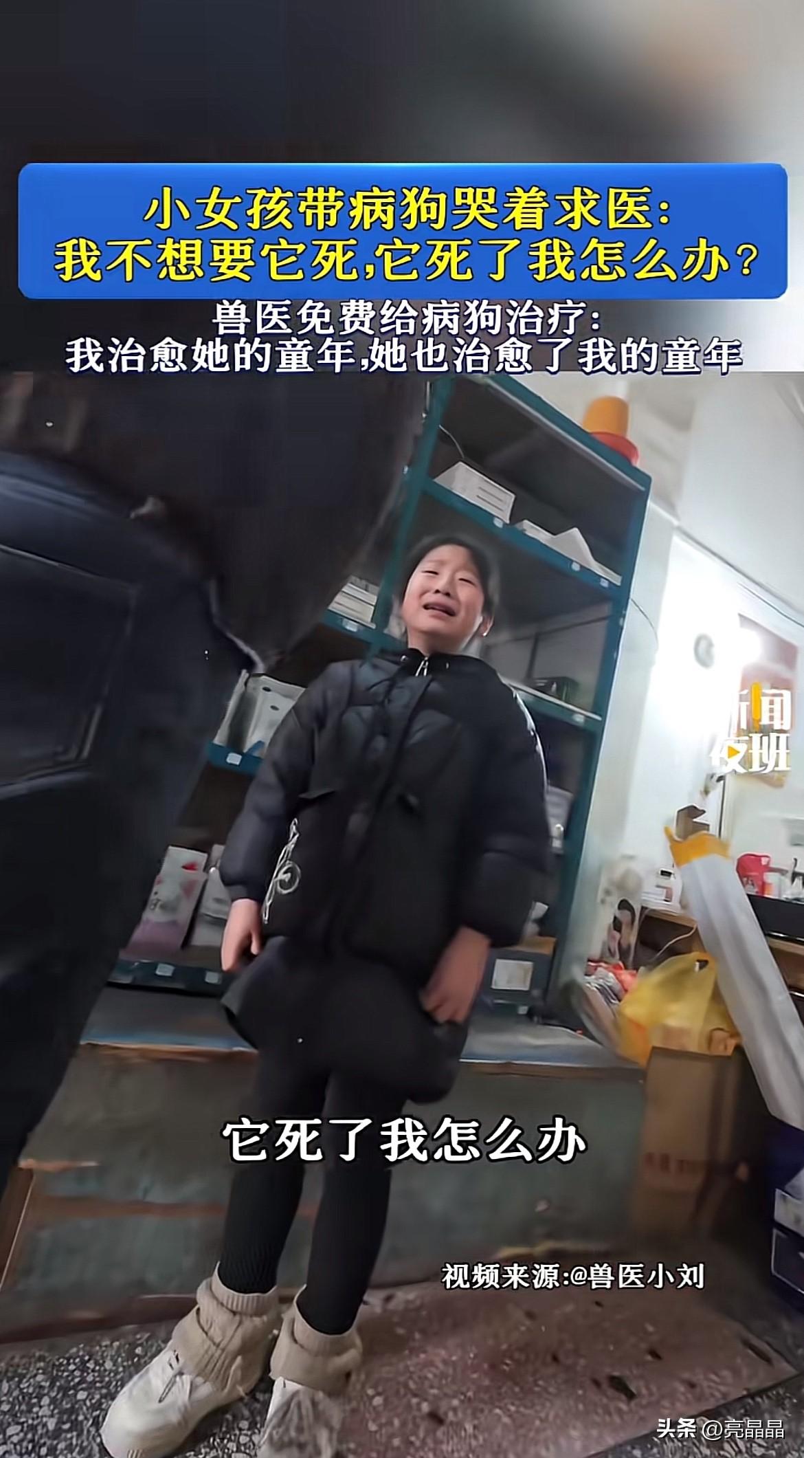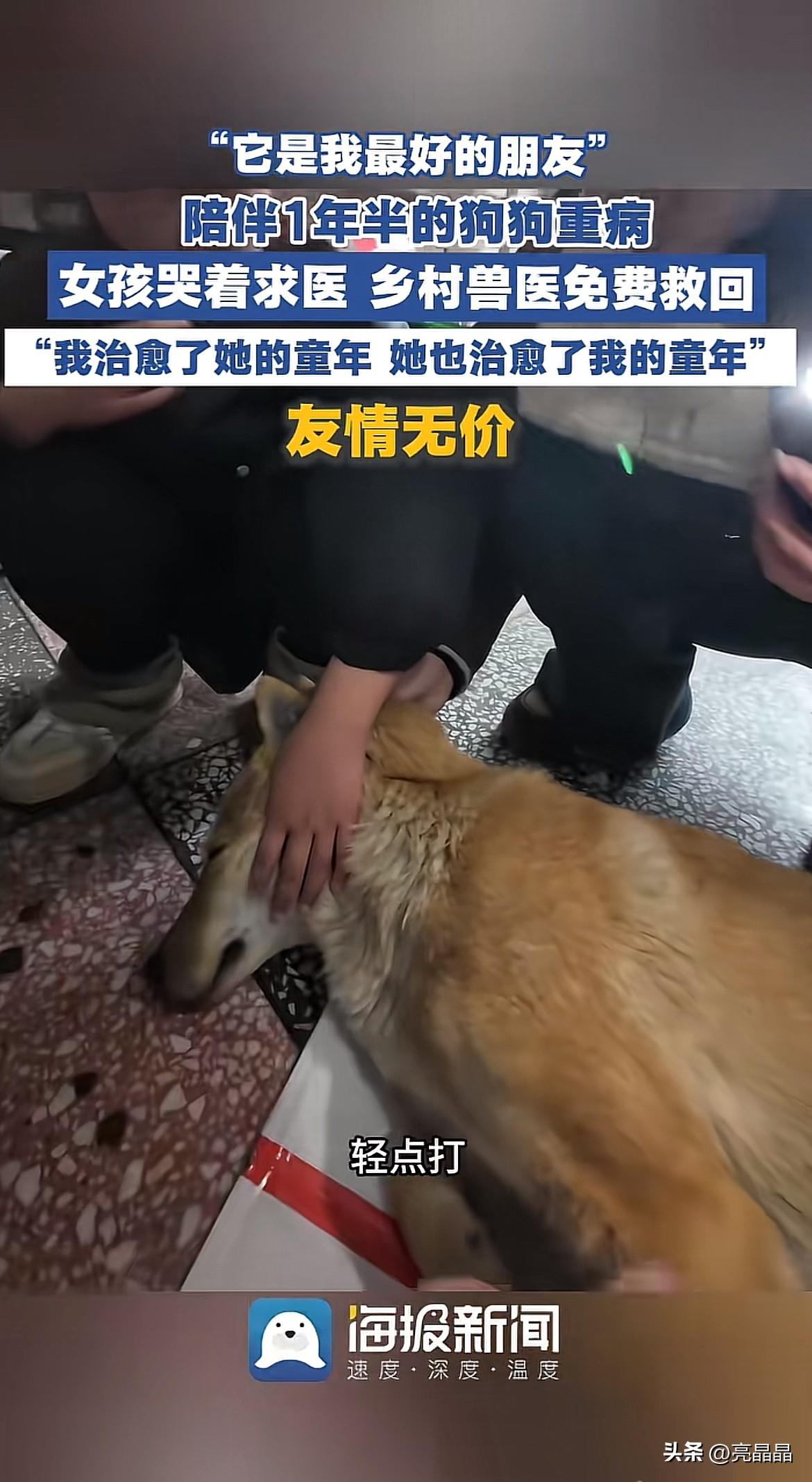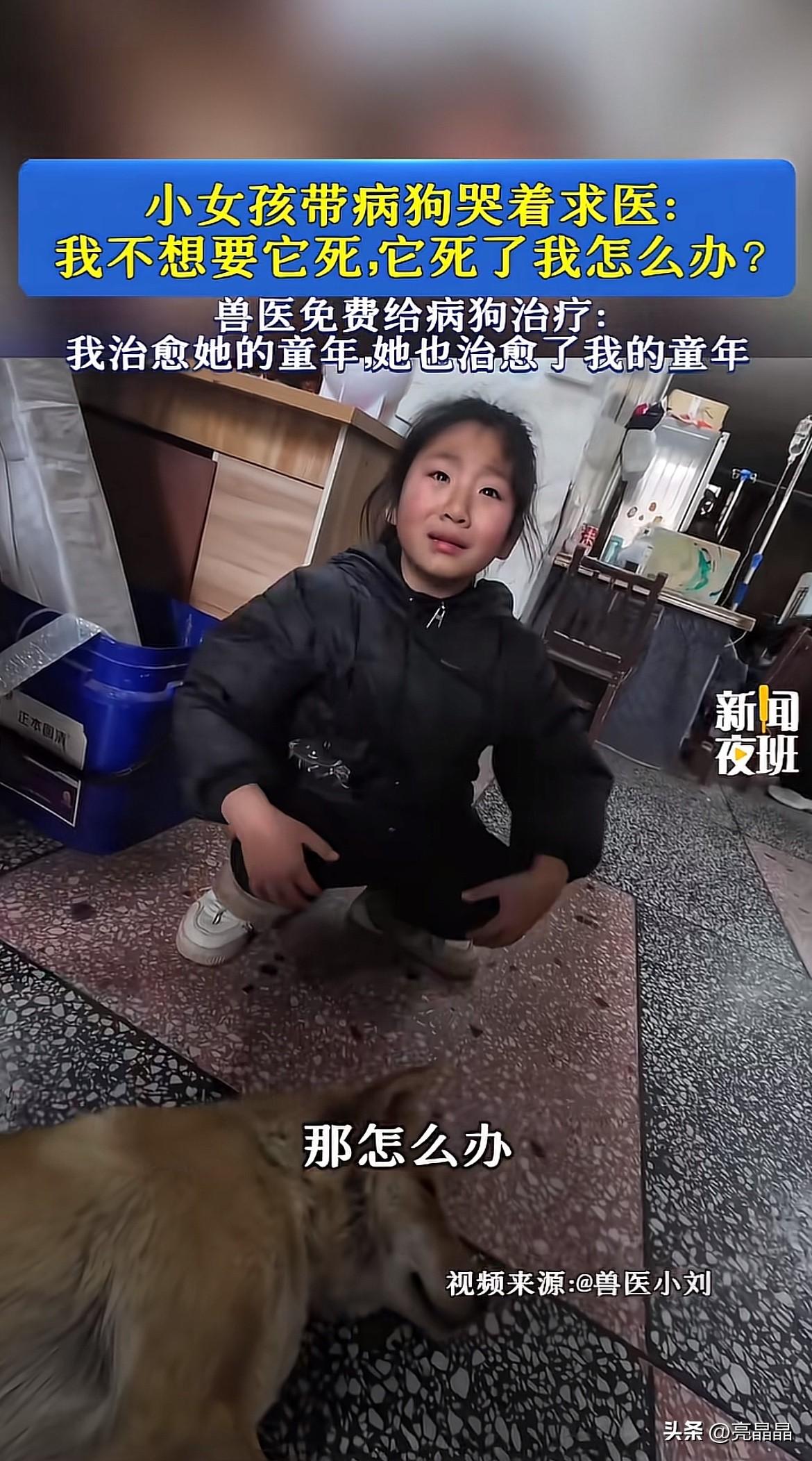 泪目了!湖南衡阳,一女孩带着重病狗狗去看兽医,得知狗狗快死了,急哭了:“我不想它死,它死了我怎么办?” 这只狗狗陪伴了女孩一年半,陪着女孩玩耍、打闹,女孩把它当成了好朋友。 不料,最近发现狗狗不对劲,感觉没有了活力,躺在地上奄奄一息,女孩和家人带着狗狗去就医。 村里兽医经常发现狗狗病情很严重,情况不是很好,跟女孩解释:“狗狗呼吸很弱,是濒临死亡的一个状态,体温只有35.8度了。” 女孩急哭了:“那怎么办?我不想它死,它是我最好的朋友,它死了,我怎么办?” 兽医看女孩哭得撕心裂肺,决定给狗狗输液治疗试试,打针过程发现狗狗的血管都找不到了,女孩很是着急,还叮嘱兽医打针轻点打,不要打疼了狗狗。 所幸经过一个小时的输液,狗狗的情况有好转,体温回升了,气息也变强了,狗狗被救回来了。 女孩高兴不已,连忙感谢医生,拿出自己的压岁钱来付医药费。 医生看着女孩,说:“不用付了!回去吧!”看着女孩高兴的笑脸感觉被治愈了。 医生直言:“我治愈了她的童年,她治愈了我的童年。” 有网友分享自己也有过这样的经历,抱着狗哭得不行,邻居笑她傻,爸爸心疼她,带狗狗去看病,结果还是没救回来。 还有网友说,我小时养的狗也病重走了,可惜当时没遇到这样的兽医,狗狗走后,我再也不敢养狗了,接受不了和它分离的感觉。 为善良的兽医点赞!为善良的女孩点赞!两位善良的天使给了毛孩子一次重生的机会。 我们养宠,不仅给生活增添了陪伴,还给自己增加了很多温暖瞬间,狗狗不仅仅是动物,更是人类最忠诚的朋友。 女孩和狗狗跨越物种的友情让人动容,让我们看到生命之间纯粹的感情连接。愿善良之人和可爱的宠物都能被温柔以待! 你是否有过和爱宠的感人故事?欢迎评论区留言。