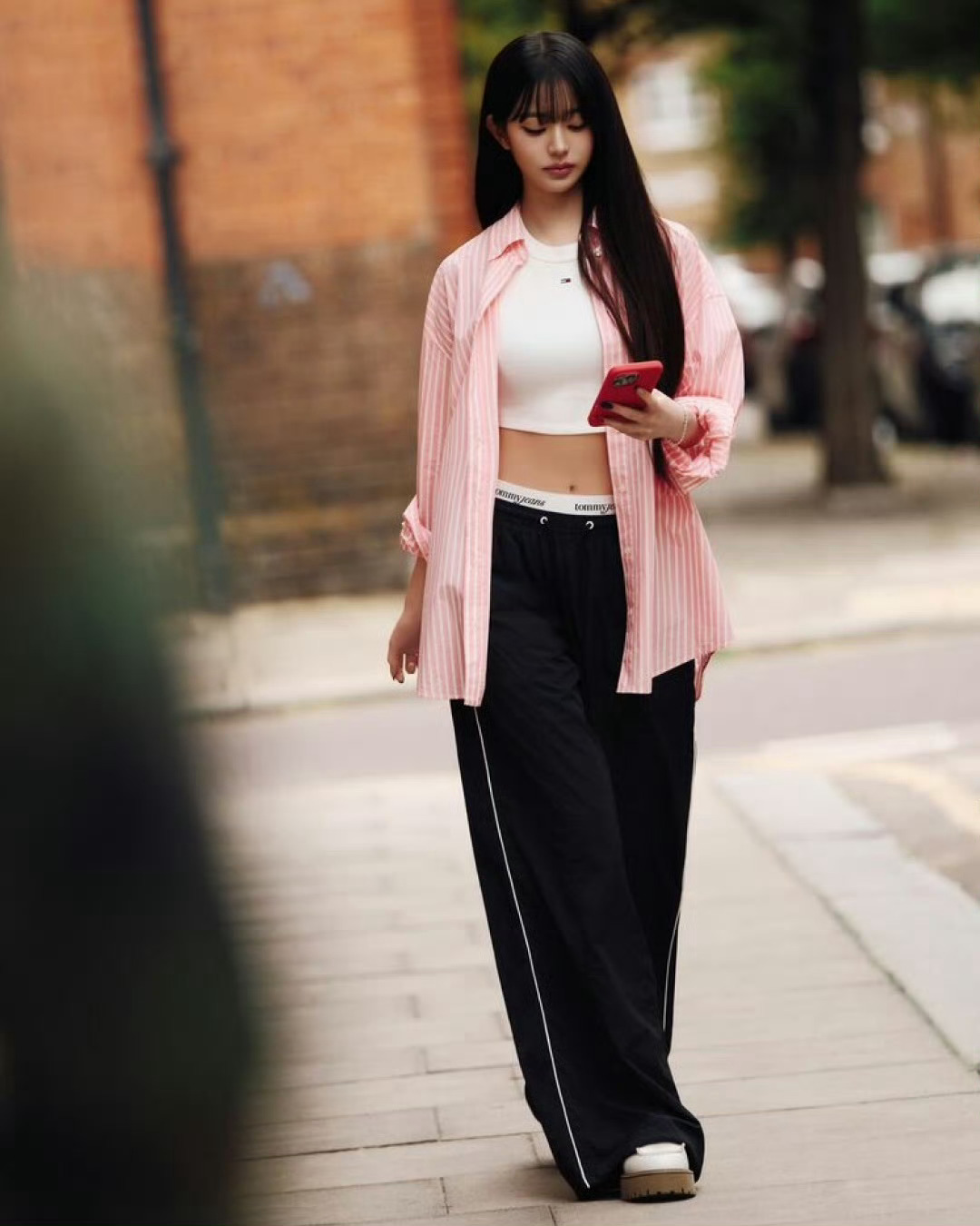 刘亦菲这条裤子挺养生,毕竟降温了肚脐眼必须护住啊