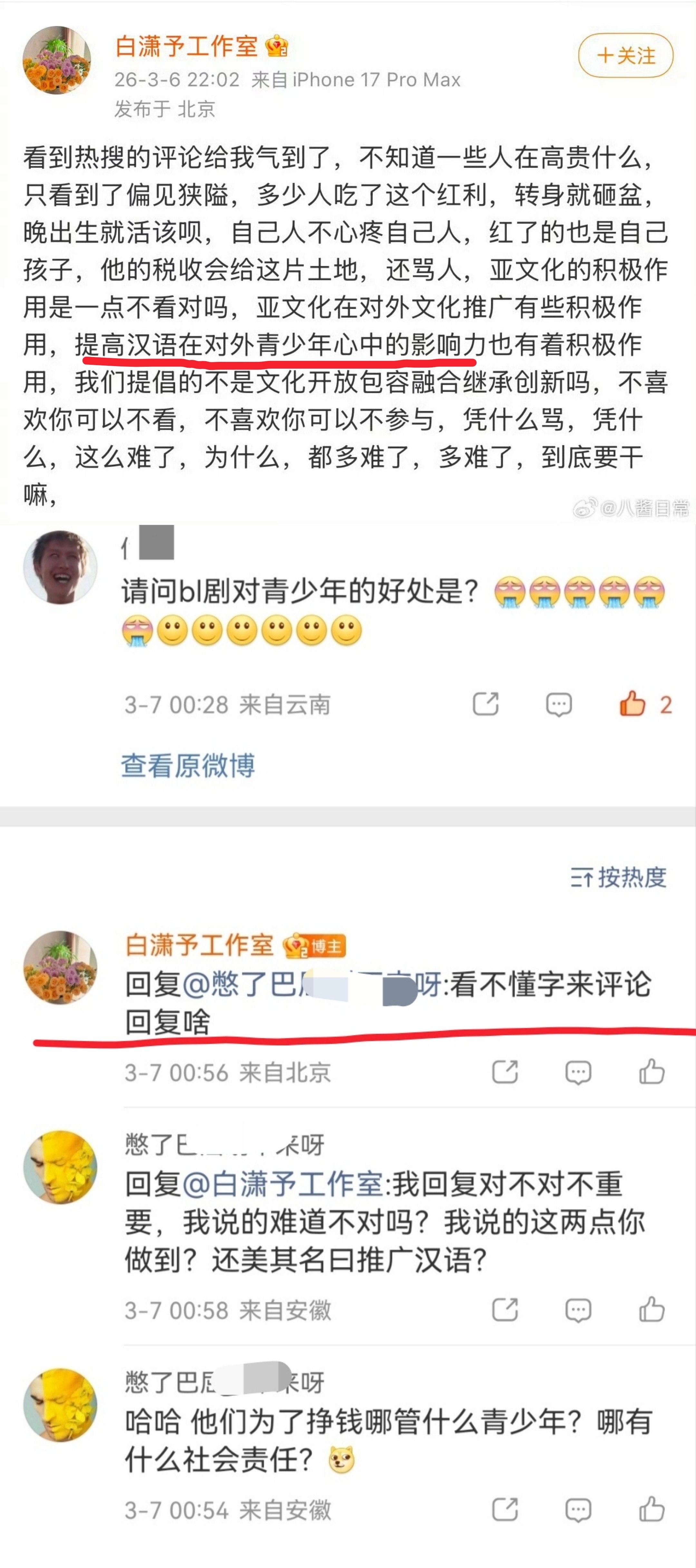 环大陆制片人发疯,说是推广汉语文化。还攻击网友把网友拉黑了。