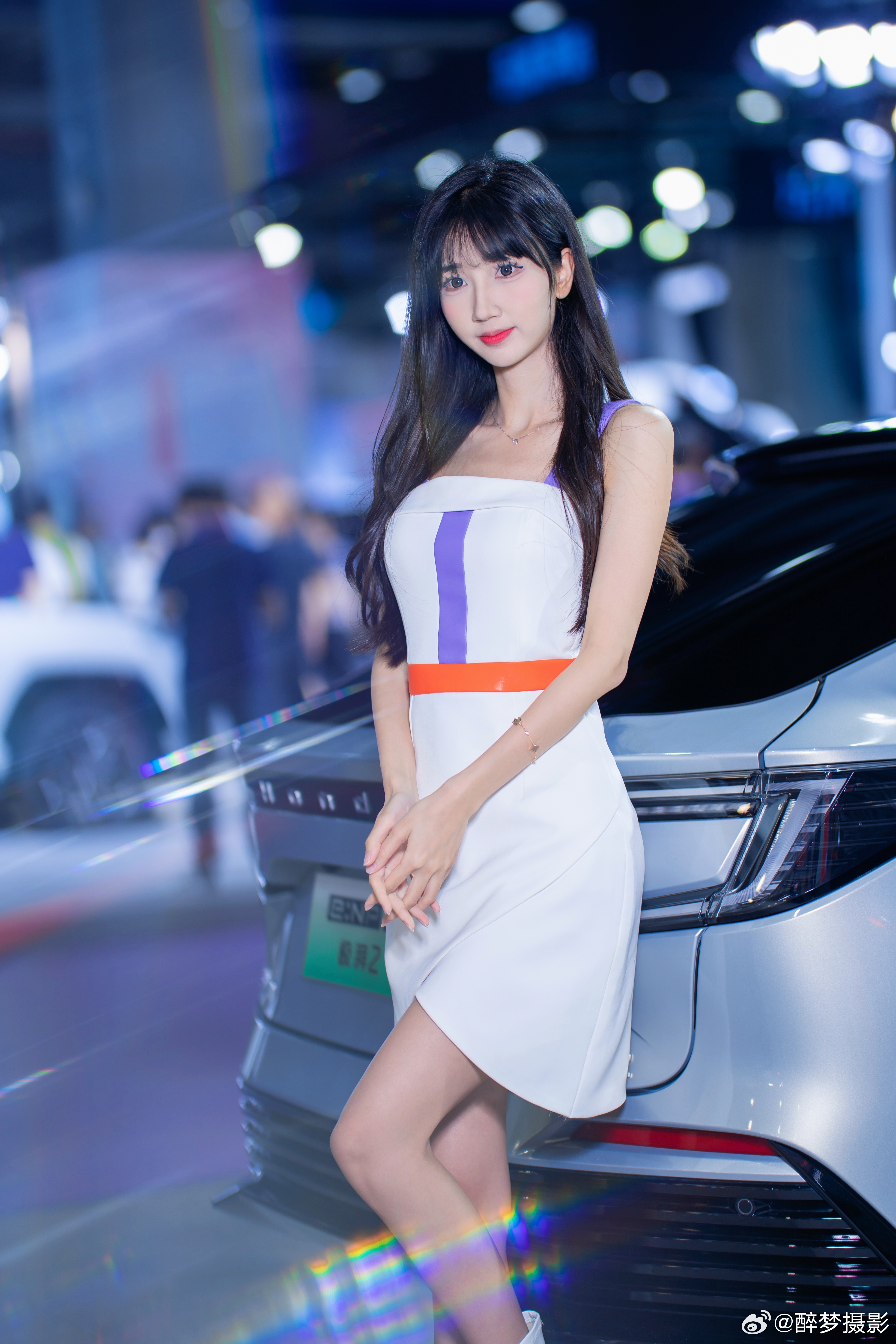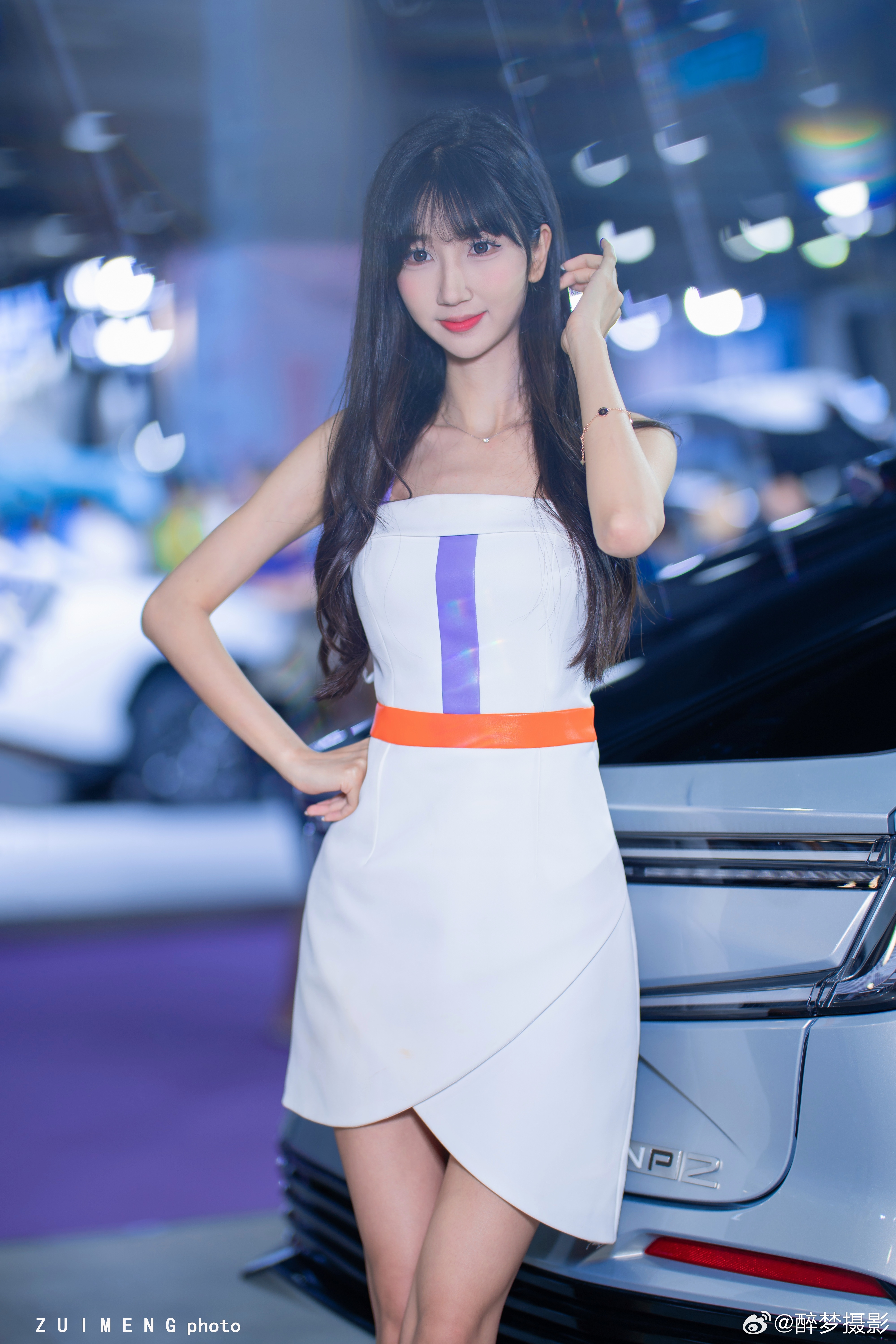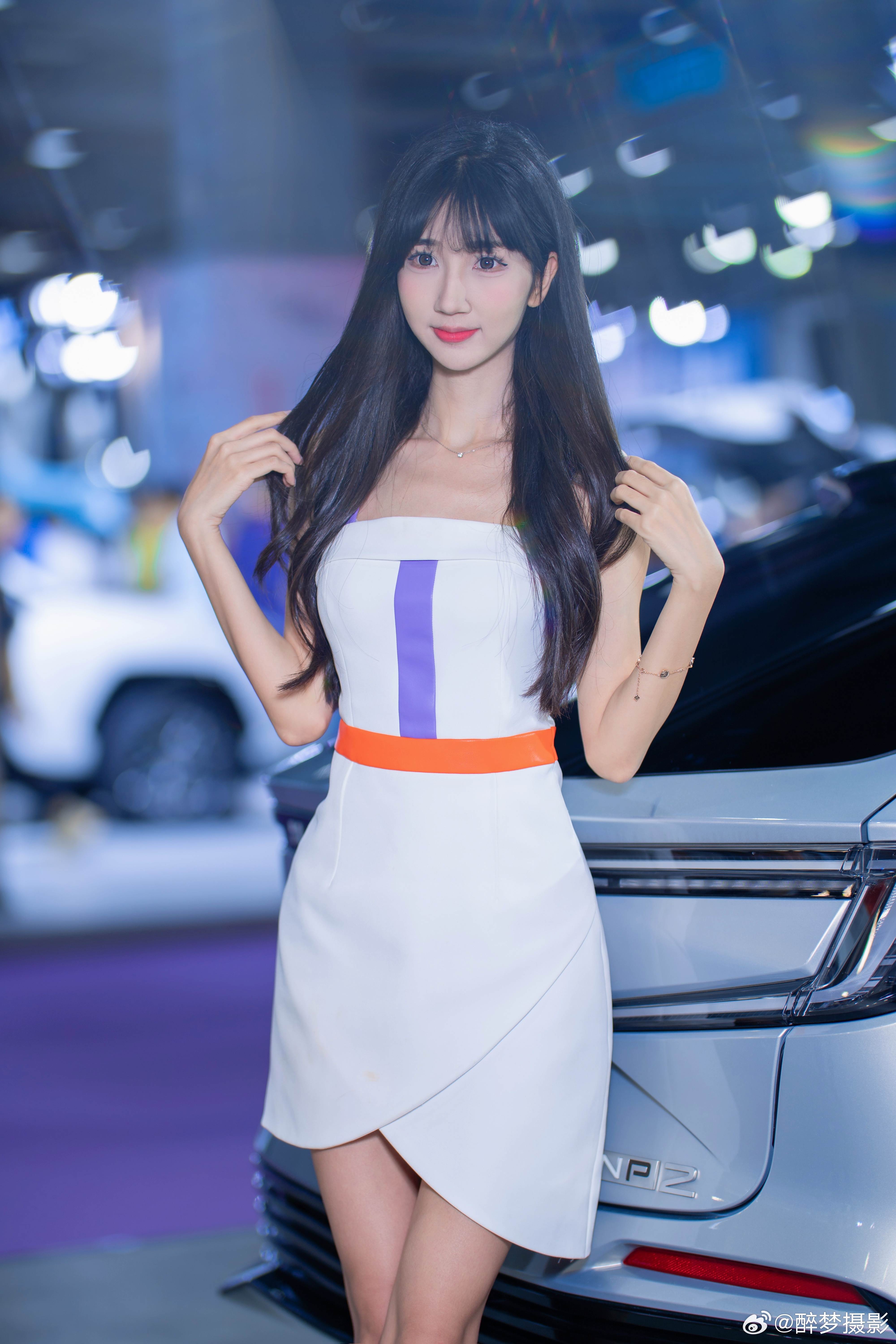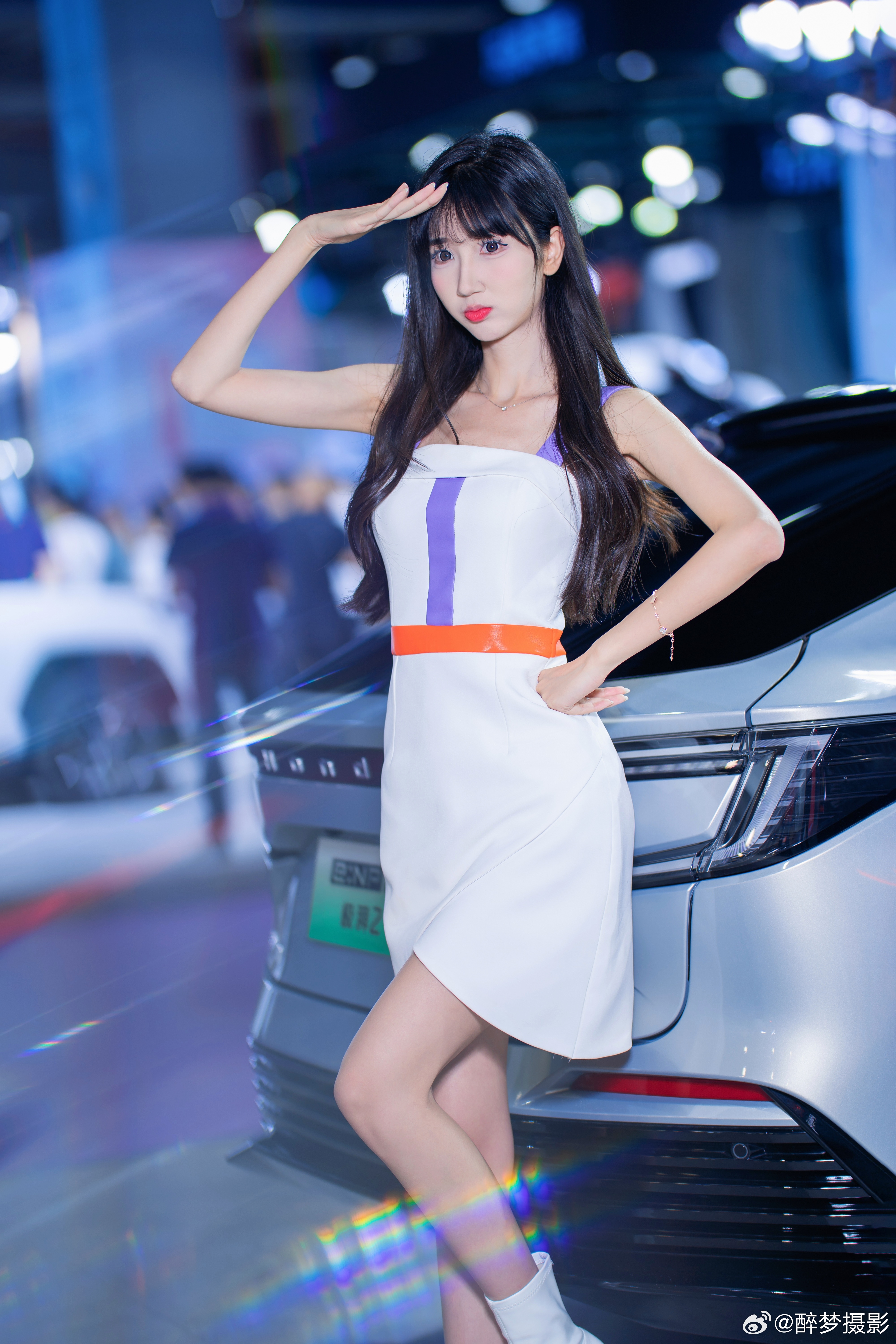 优雅与科技的邂逅✨ 白色礼裙搭配橙紫撞色腰带,尽显灵动气质~ 身旁的NP2车型低调奢华,未来感拉满!