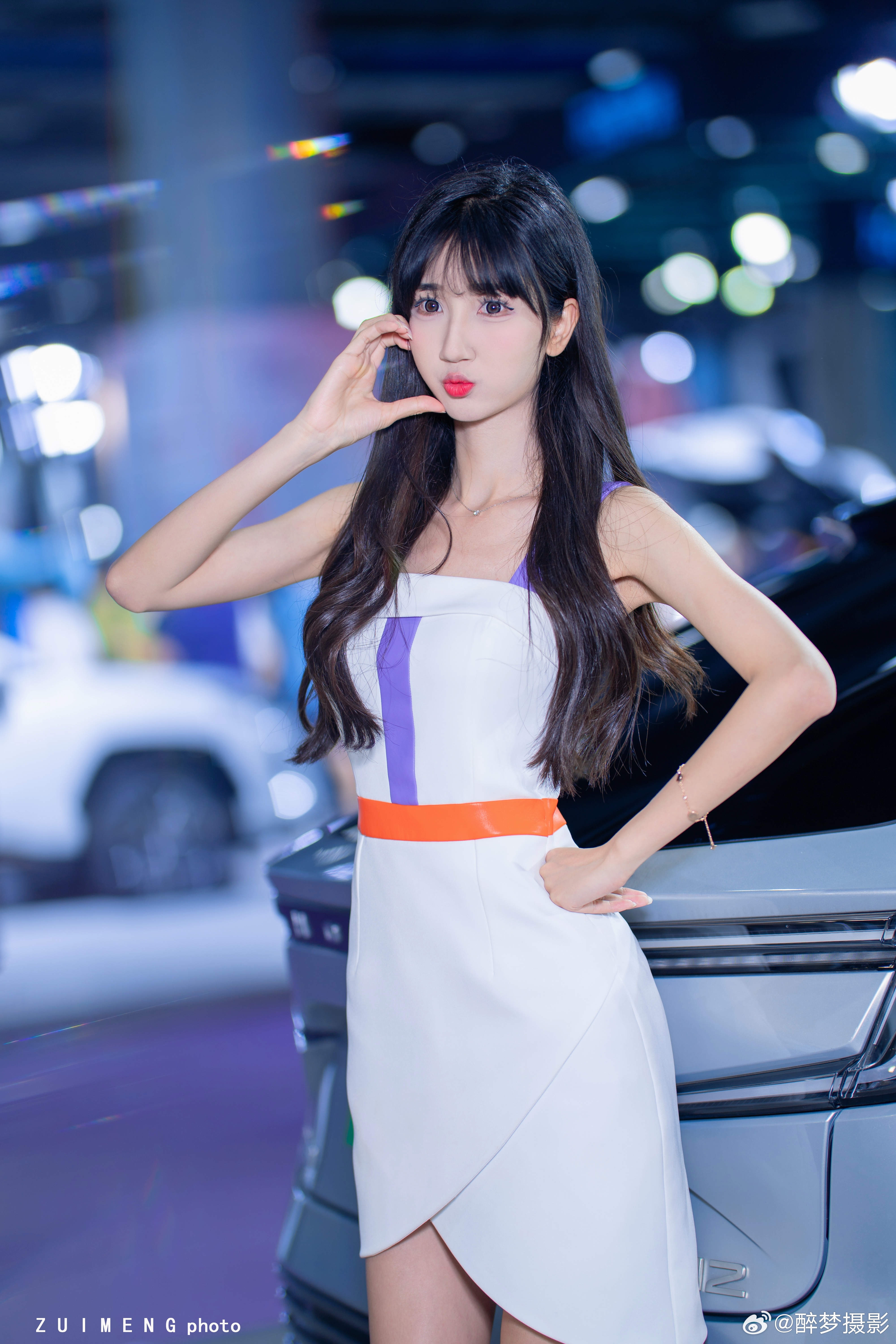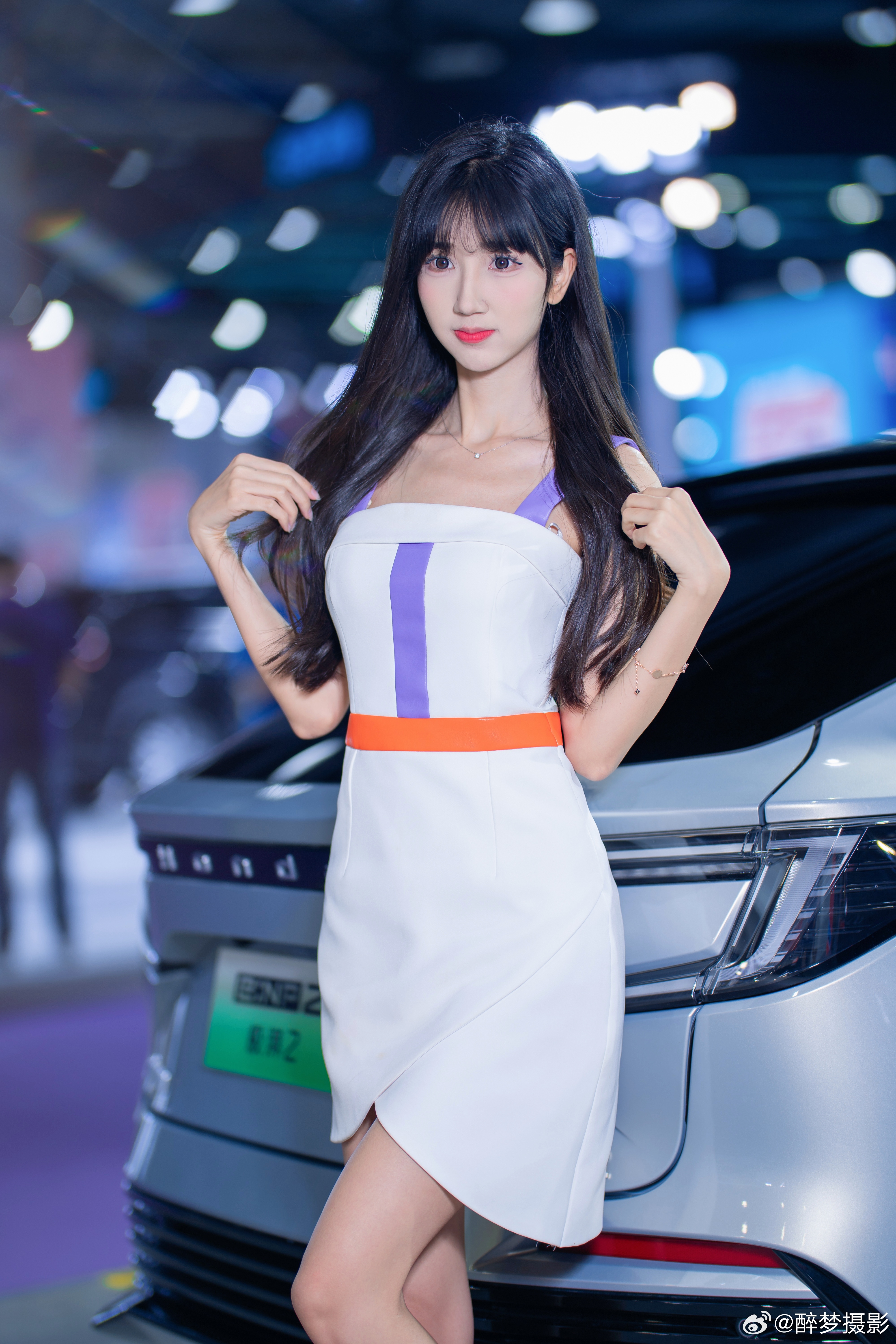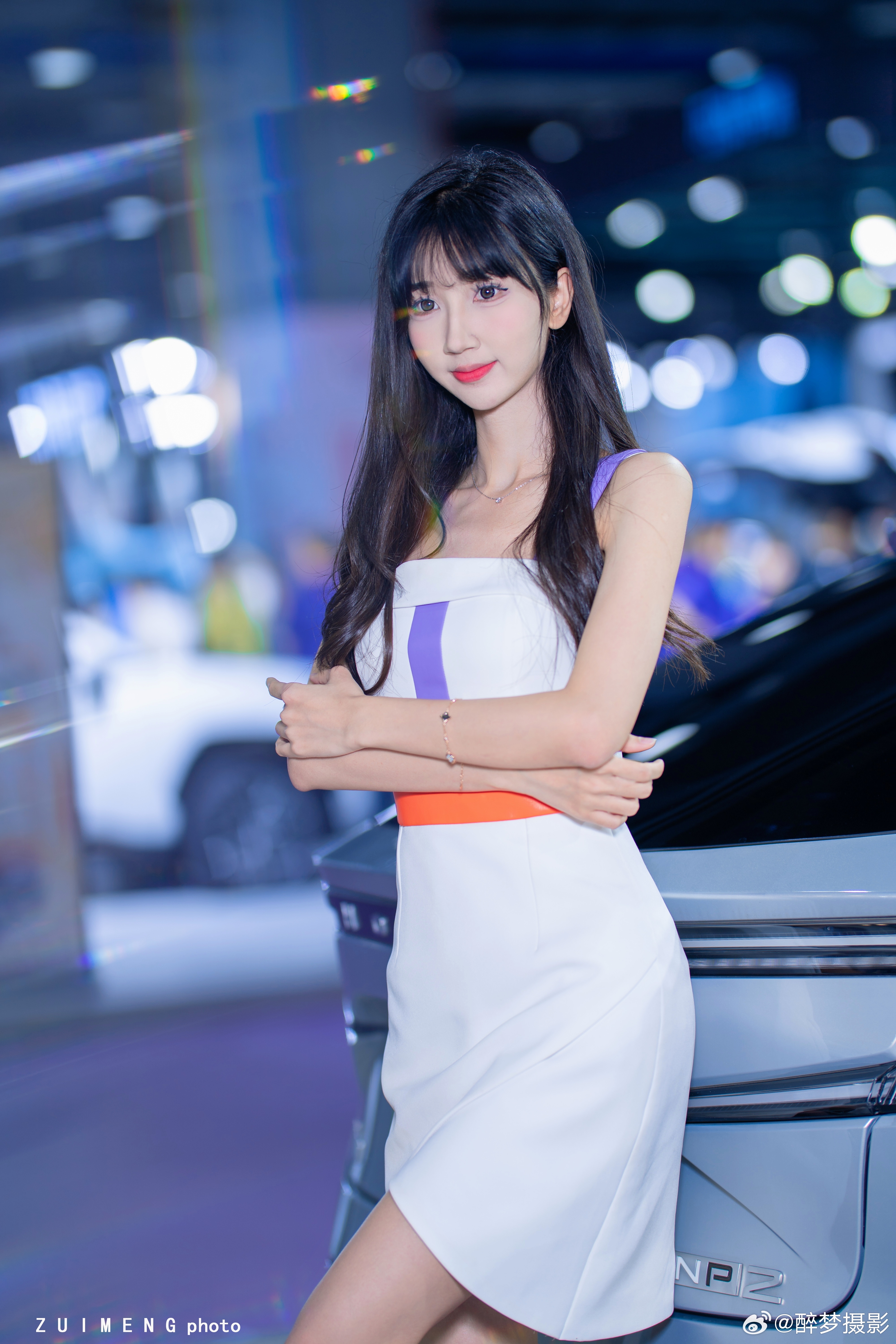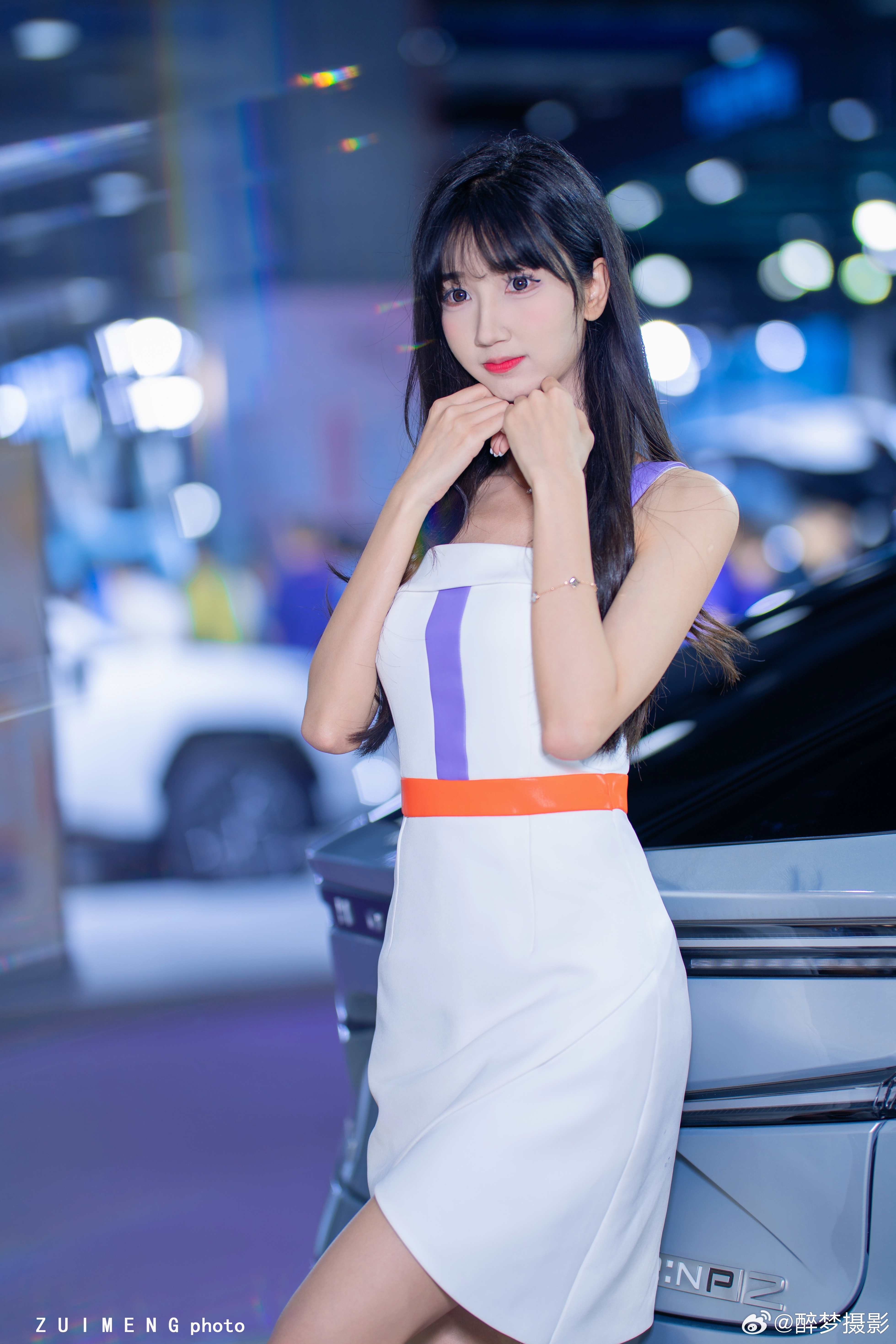 优雅与科技的邂逅✨ 白色礼裙搭配橙紫撞色腰带,尽显灵动气质~ 身旁的NP2车型低调奢华,未来感拉满!