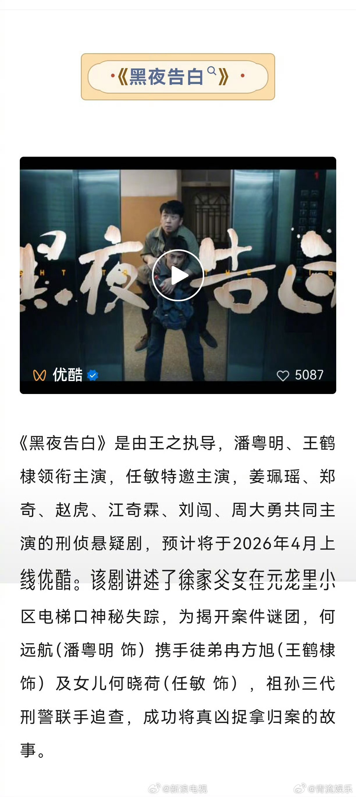 王鹤棣黑夜告白招商黑夜告白4月播出 由王之执导,主演的刑侦悬疑剧《黑夜告白》,预计将于2026年4月上线优酷。该剧讲述了徐家父女在元龙里小区电梯口神秘失踪,为揭开案件谜团,何远航携手徒弟冉方旭及女儿何晓荷,祖孙三代刑警联手追查,成功将真凶捉拿归案的故事。