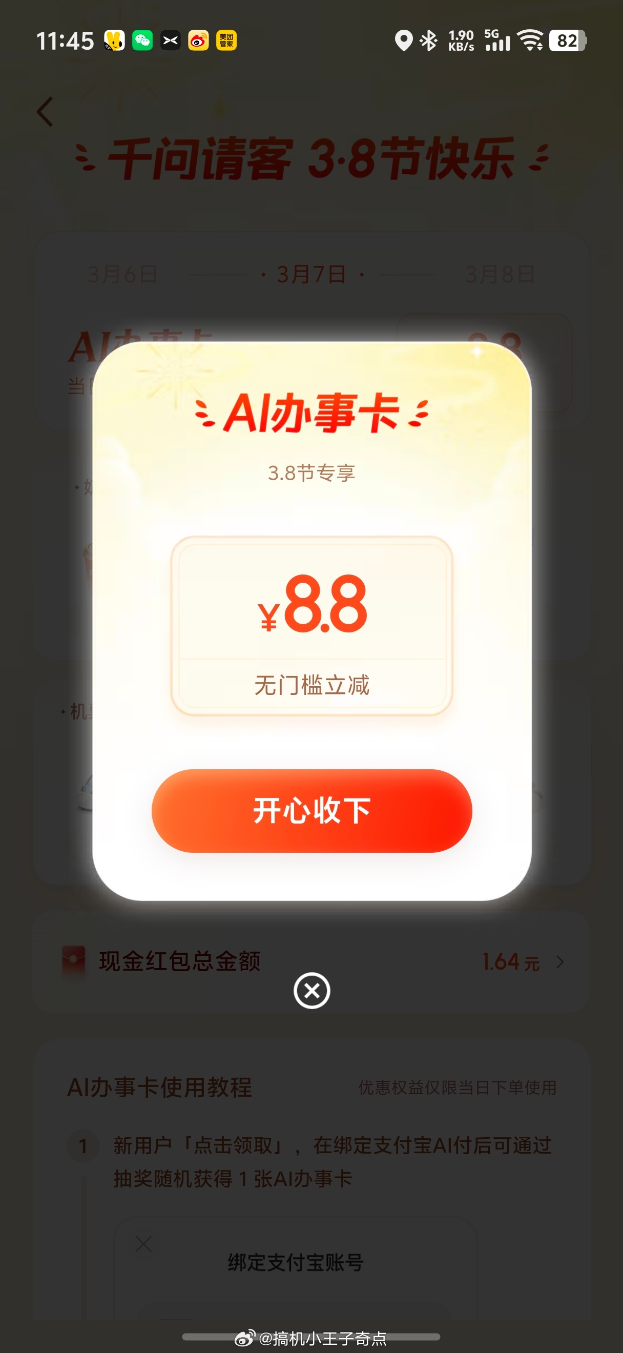 千问AI一句话下单无门槛立减他真行啊昨天3.8今天8.8关键还能叠加闪购里的红包