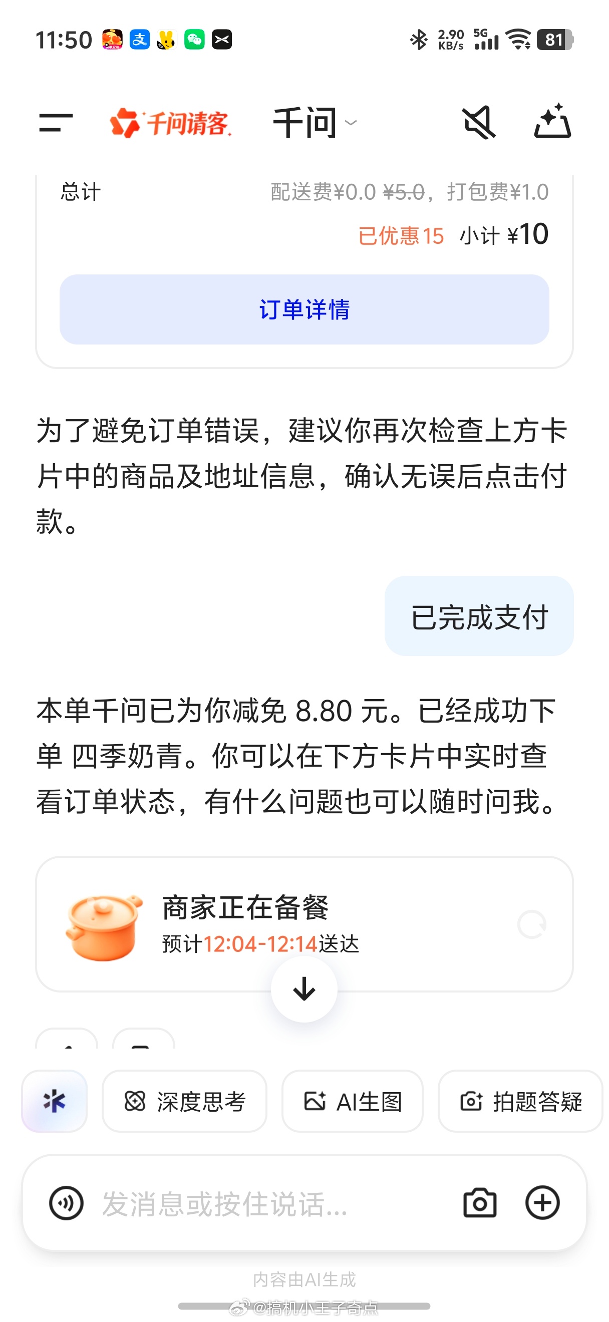 千问AI一句话下单无门槛立减他真行啊昨天3.8今天8.8关键还能叠加闪购里的红包1.2喝一点点了