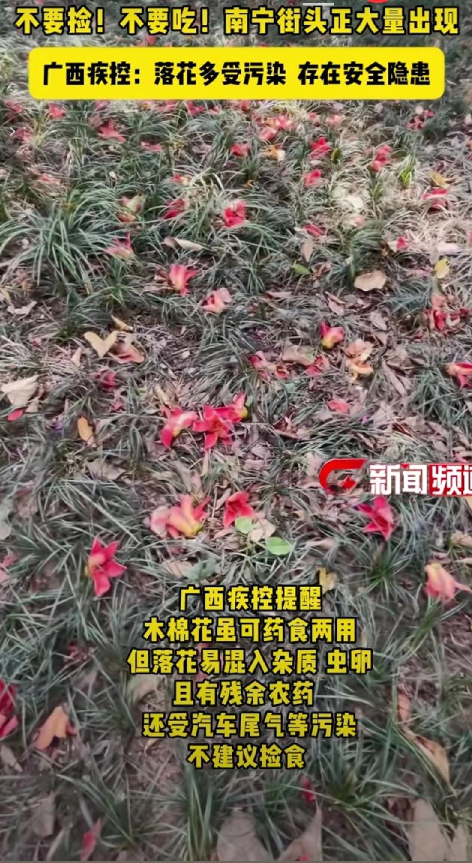 近期南宁木棉花盛放,飘落的红花铺满路边,不少市民捡拾回家煲汤、做菜。但广西疾控提醒,木棉花虽可药食两用,可落花易混入杂质、虫卵,且有残余农药,还受汽车尾气等污染,存在安全隐患,不建议捡食。(来源于@广西新闻频道 )
