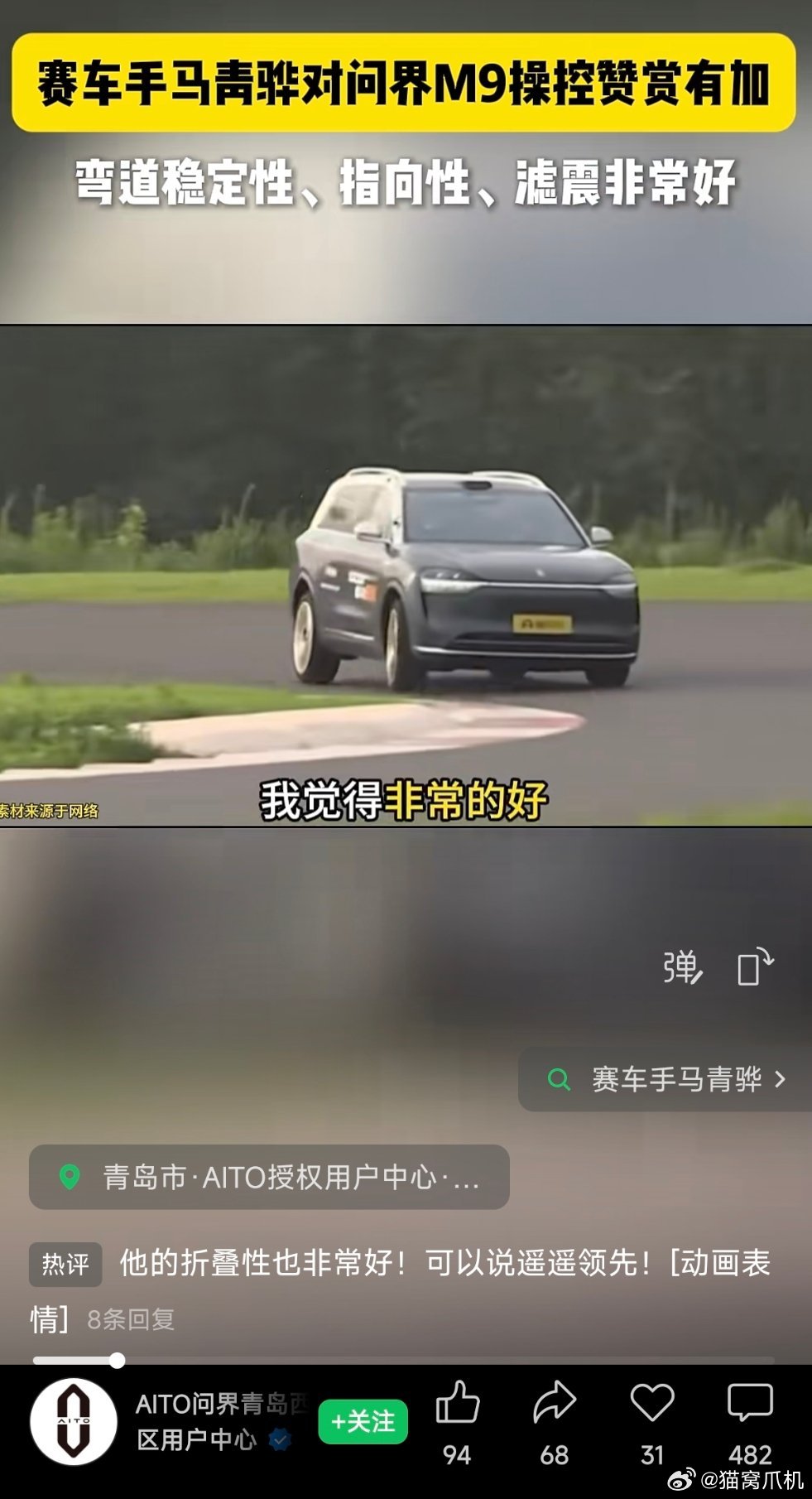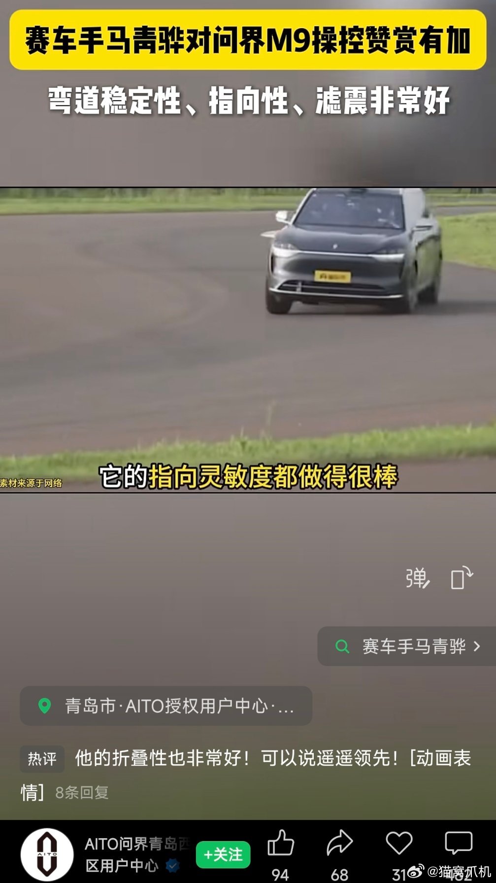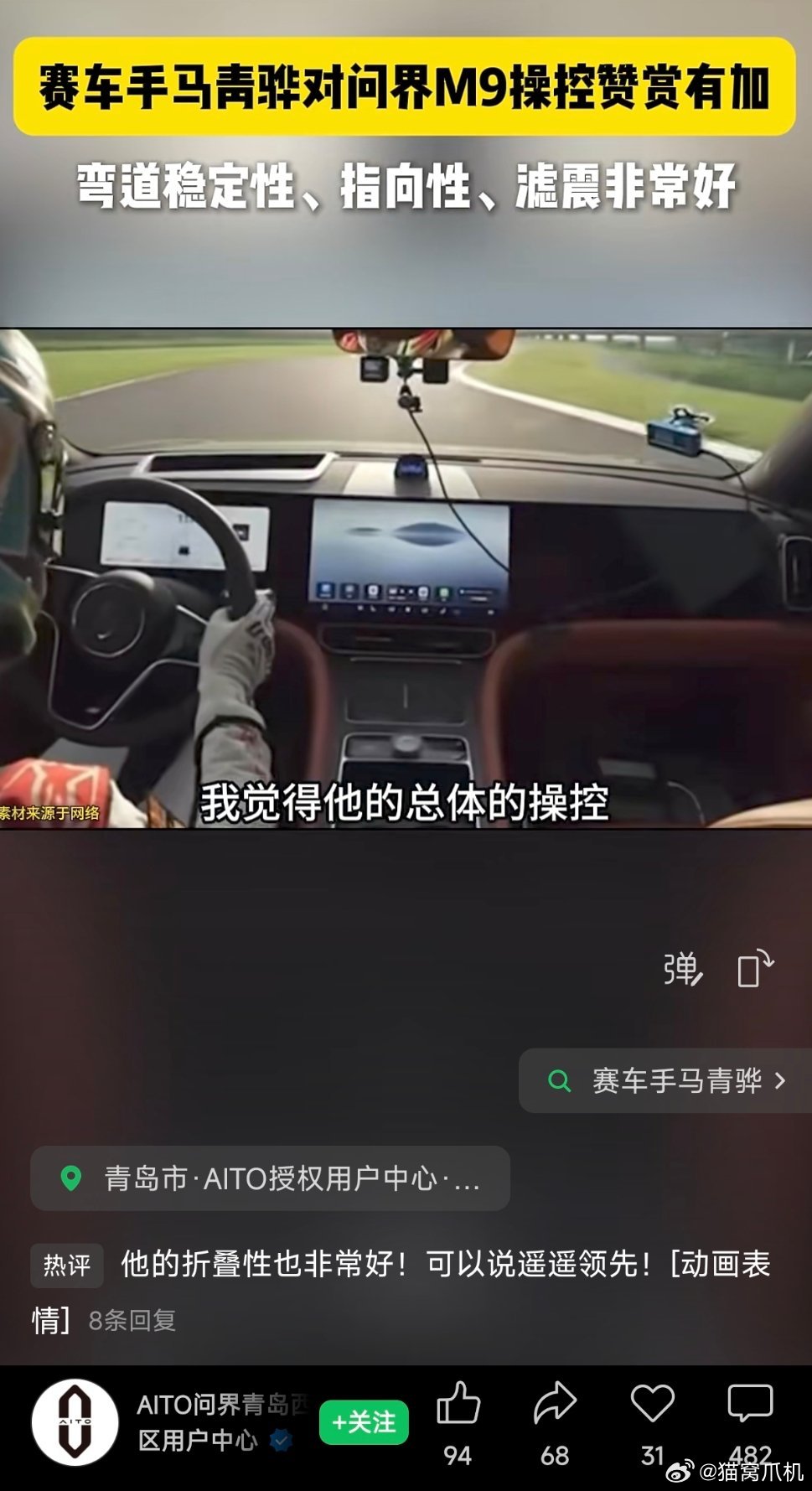 赛车手马青骅对问界m9操控赞赏有加