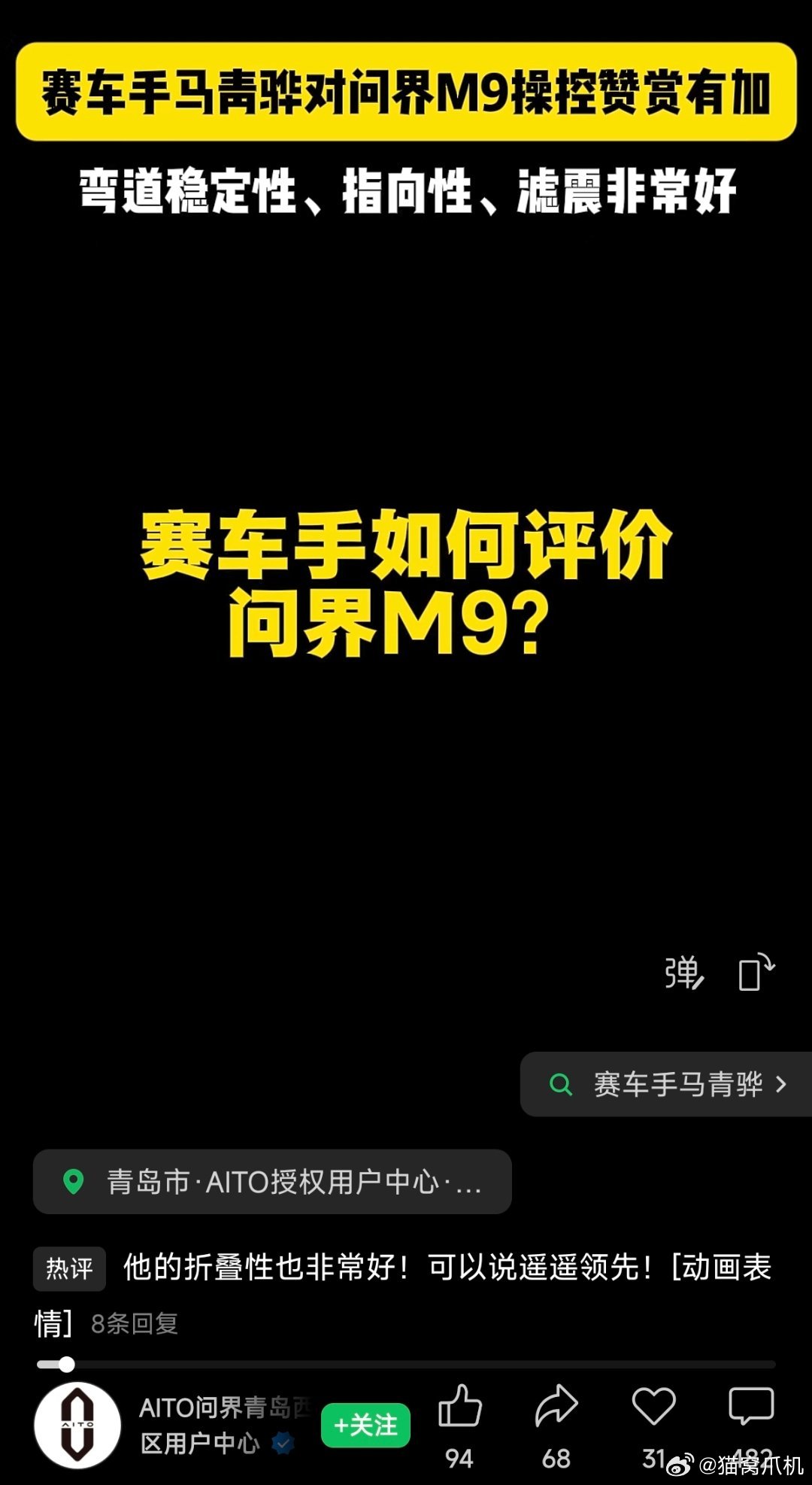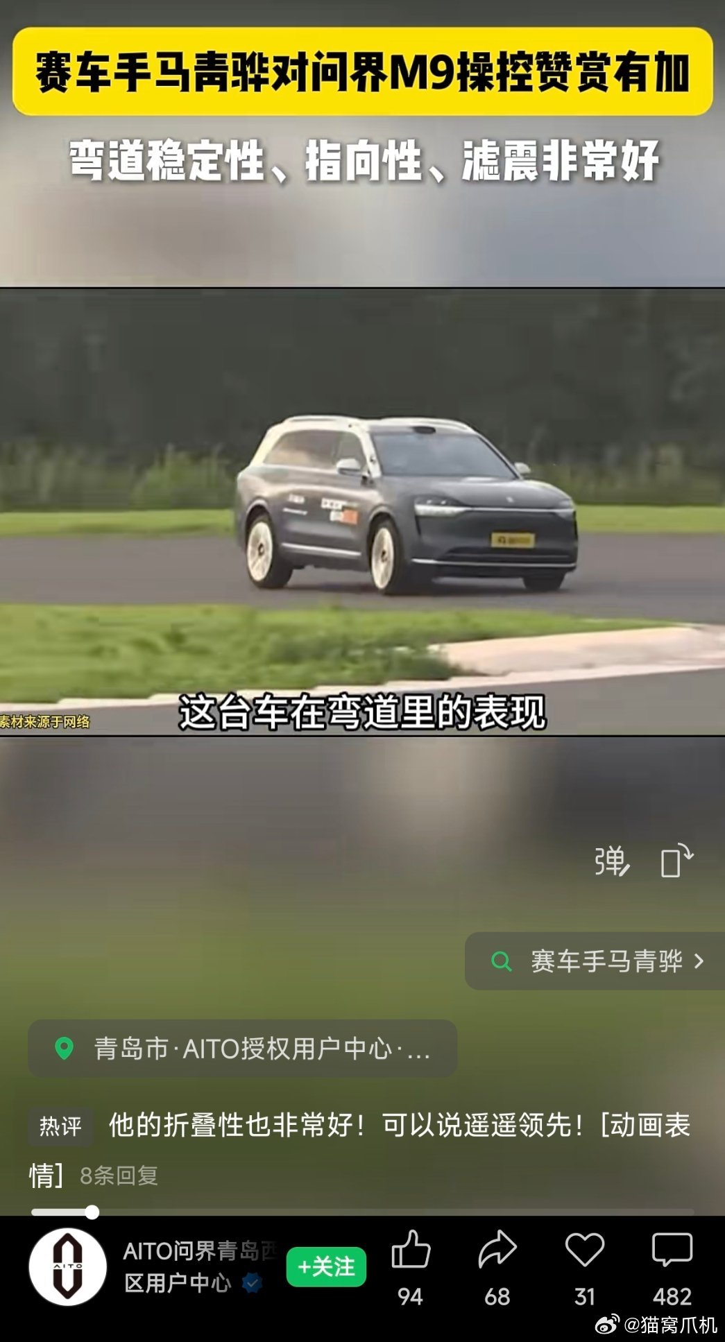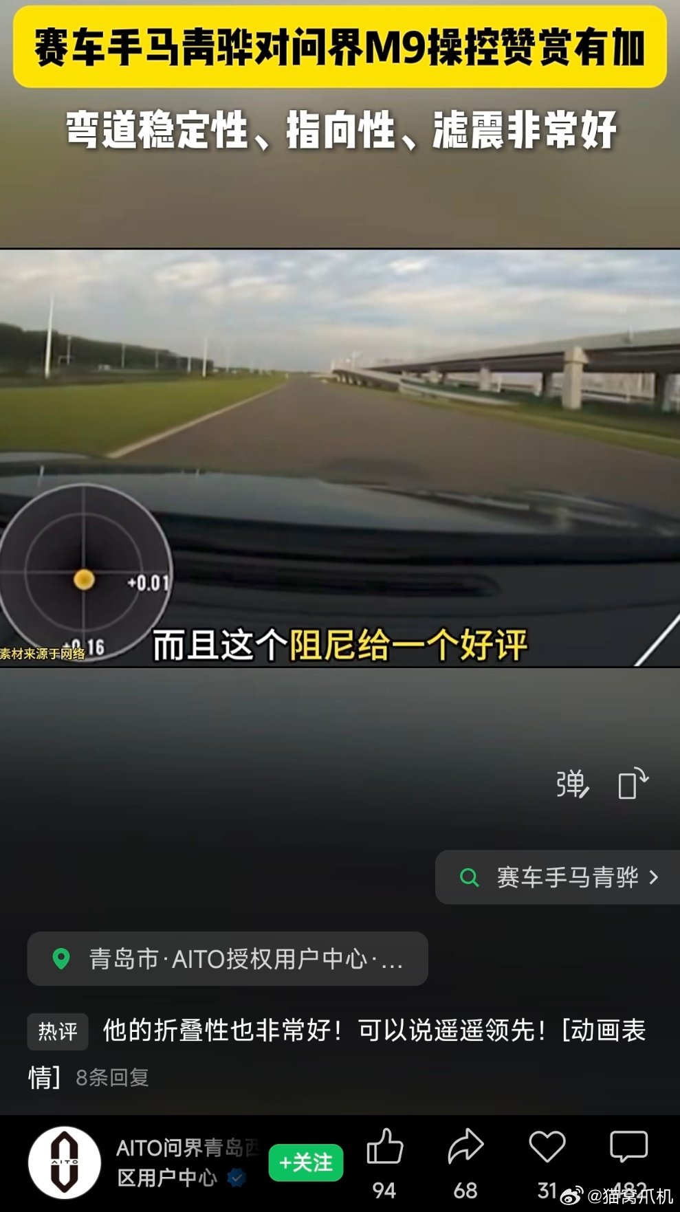 赛车手马青骅对问界m9操控赞赏有加