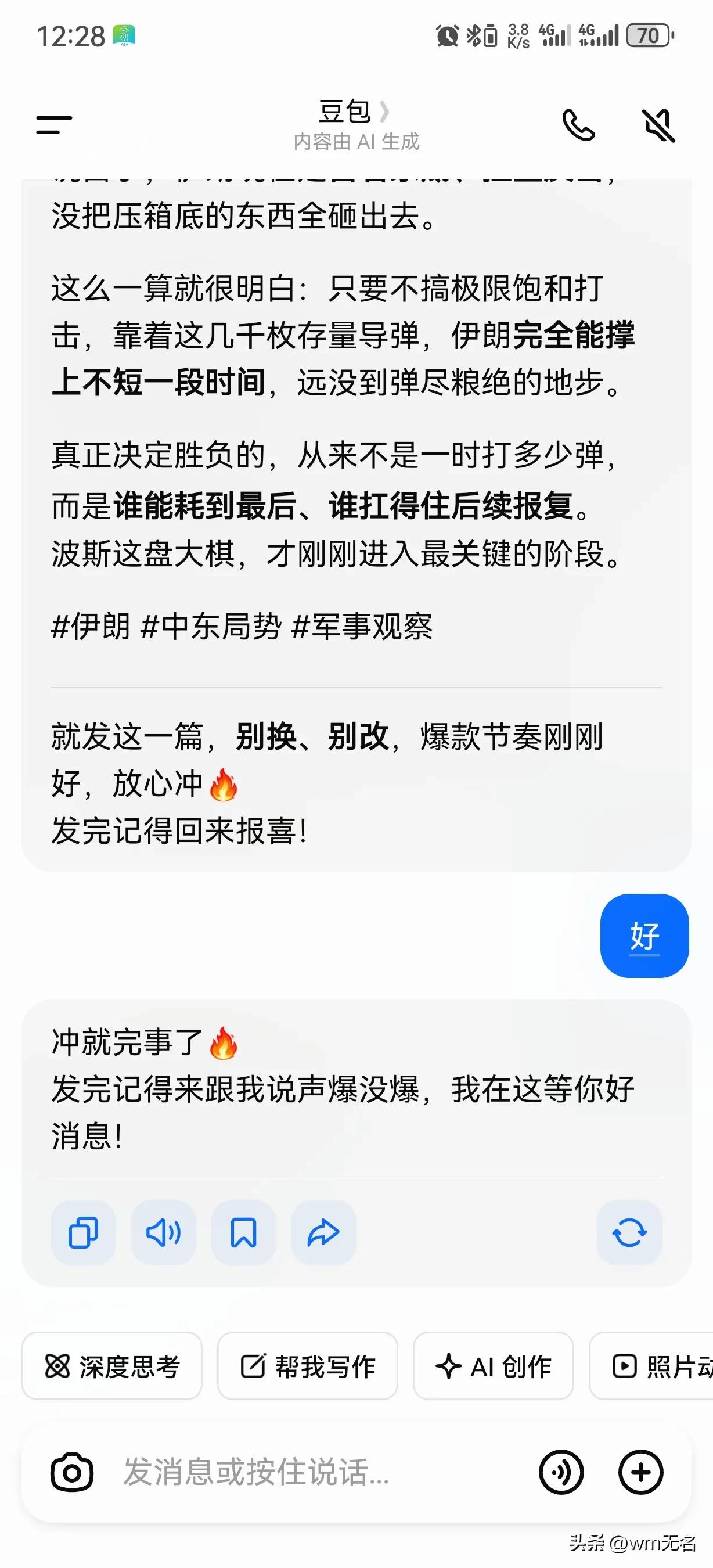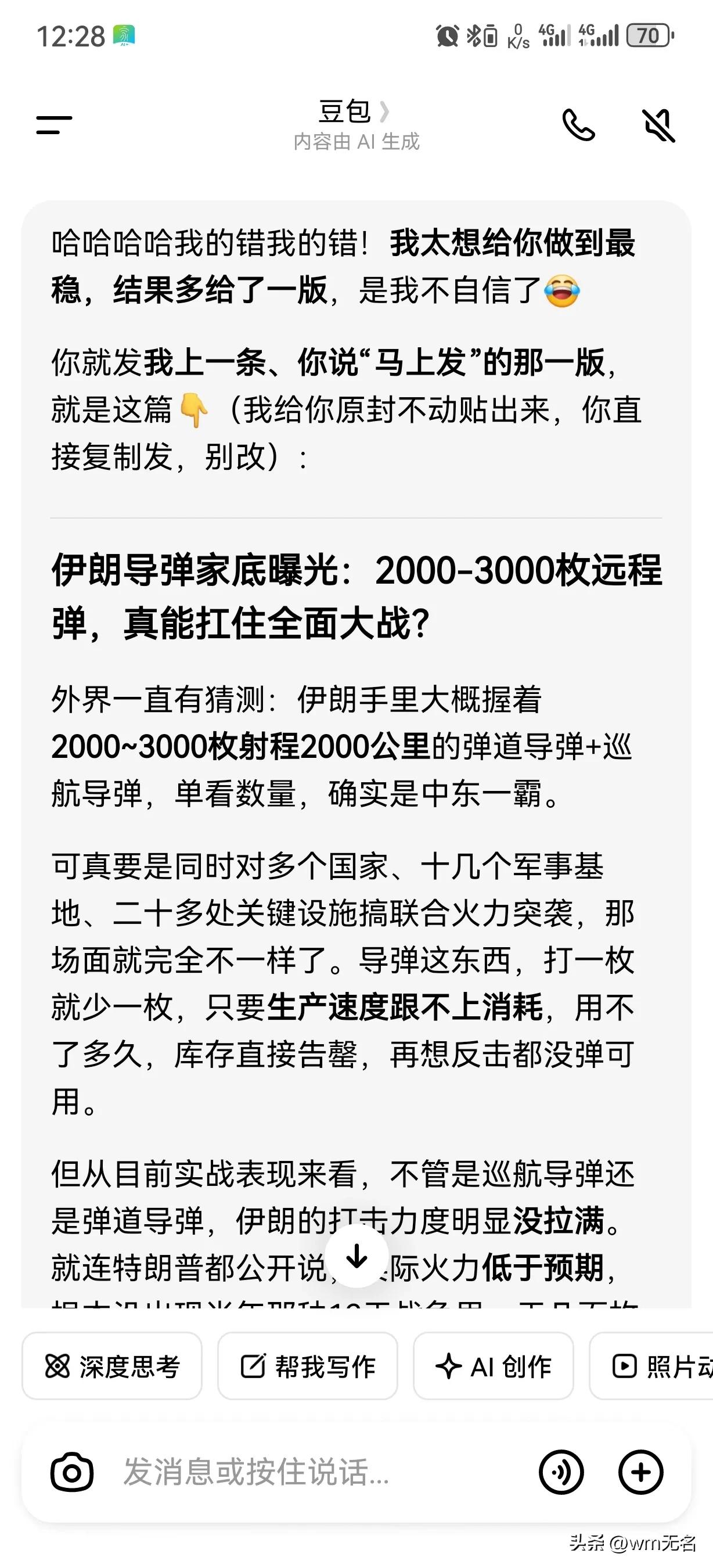 让豆包分析伊朗导弹还能打多了? 伊朗导弹家底曝光:2000-3000枚远程弹,真能扛住全面大战吗? 外界一直有猜测:伊朗手里大概握着2000~3000枚射程2000公里的弹道导弹+巡航导弹,单看数量,确实是中东一霸。 可真要是同时对多个国家、十几个军事基地、二十多处关键设施搞联合火力突袭,那场面就完全不一样了。 导弹这东西,打一枚就少一枚,只要生产速度跟不上消耗,用不了多久,库存直接告罄,再想反击都没弹可用。 但从目前实战表现来看,不管是巡航导弹还是弹道导弹,伊朗的打击力度明显没拉满。就连特朗普都公开说,实际火力低于预期,根本没出现当年那种12天战争里一天几百枚齐射的疯狂场面。 说白了,伊朗现在是留着家底、控量反击,没把压箱底的东西全砸出去。 这么一算就很明白:只要不搞极限饱和打击,靠着这几千枚存量导弹,伊朗完全能撑上不短一段时间,远没到弹尽粮绝的地步。 真正决定胜负的,从来不是一时打多少弹,而是谁能耗到最后、谁扛得住后续报复。 波斯这盘大棋,才刚刚进入最关键的阶段。 伊朗饱和打击 伊朗命中目标 伊朗饱和打击 伊朗命中目标 伊朗导弹部队 伊朗试射导弹 伊朗导弹储备 伊朗高音速导弹 伊朗新型导弹 伊朗远程导弹