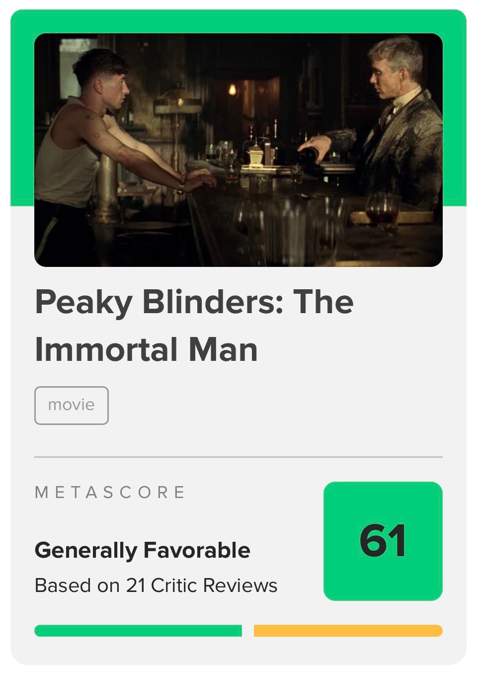大电影《浴血黑帮:不朽传奇》北美口碑解禁,目前烂番茄新鲜度93%,Metacritic综合均分61。