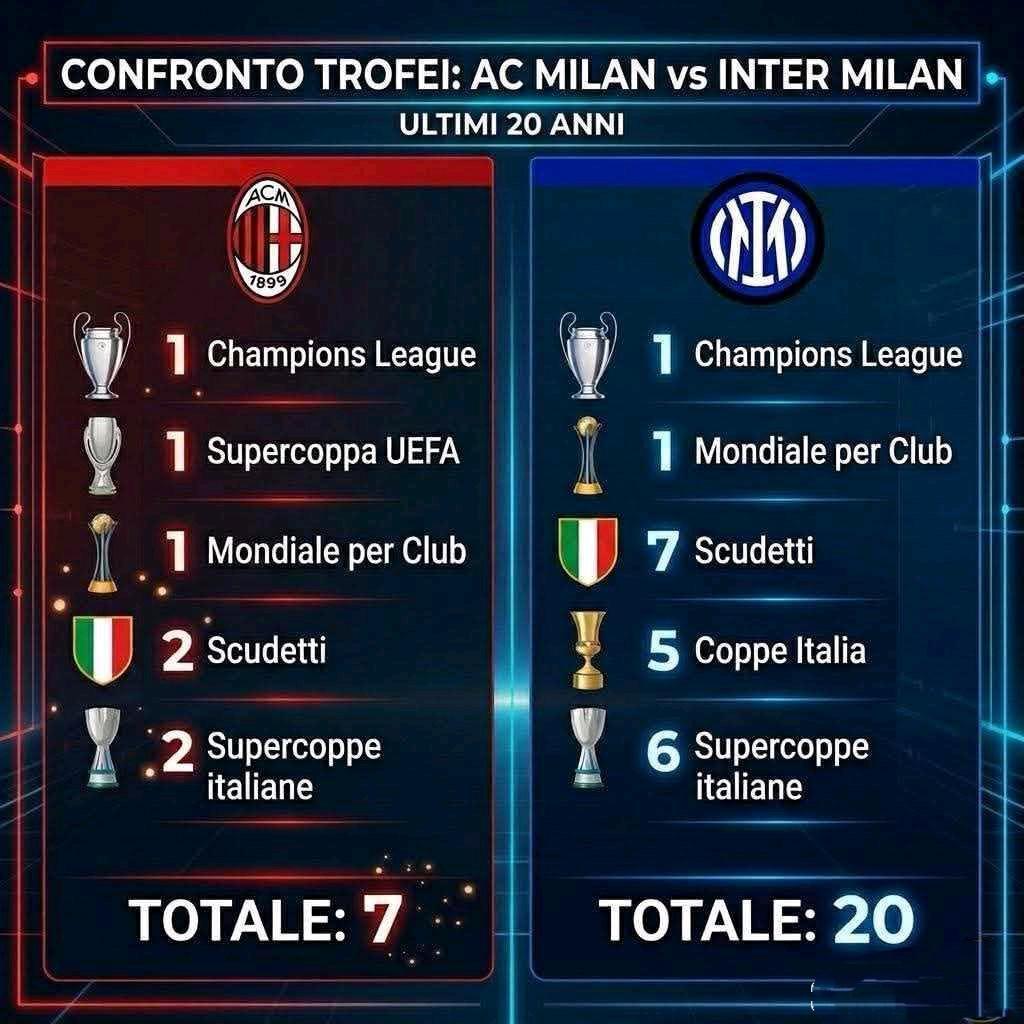 最近20年两个米兰荣誉对比,国际米兰>AC米兰。 国米是2010年欧冠冠军,7个意甲冠军。 米兰是2007年欧冠冠军,2个意甲冠军。 感觉还是电话门影响太大,导致米兰在意甲追不过国米。 今年国际米兰大概率又拿意甲冠军了。[大金牙]