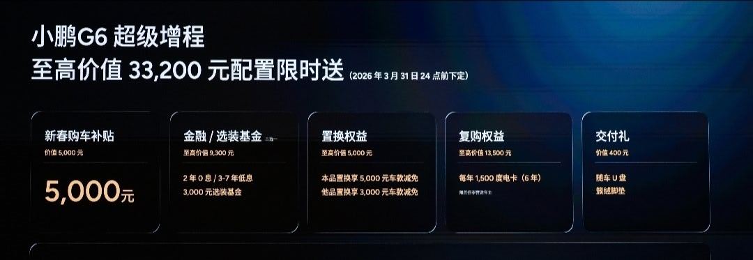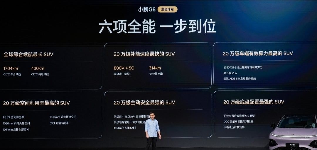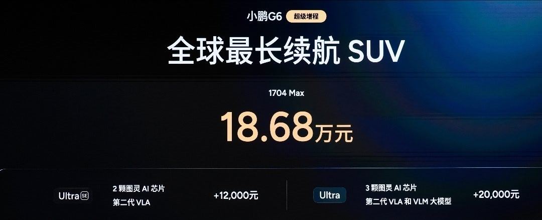 小鹏G6超级增程拥有55.8kWh大电池+60L大油箱,CLTC综合续航 1704km,并且CLTC纯电续航达到了 430km。真正做到一次充电通勤一周,加一次油跨省无忧!再加上全系标配800V+5C的车型,12分钟就可以补能314km。价格方面,小鹏G6超级增程18.68万起共有1704 Max,Ultra SE和Ultra三个版本。还有最高价值33200元的限时权益礼包。 西安