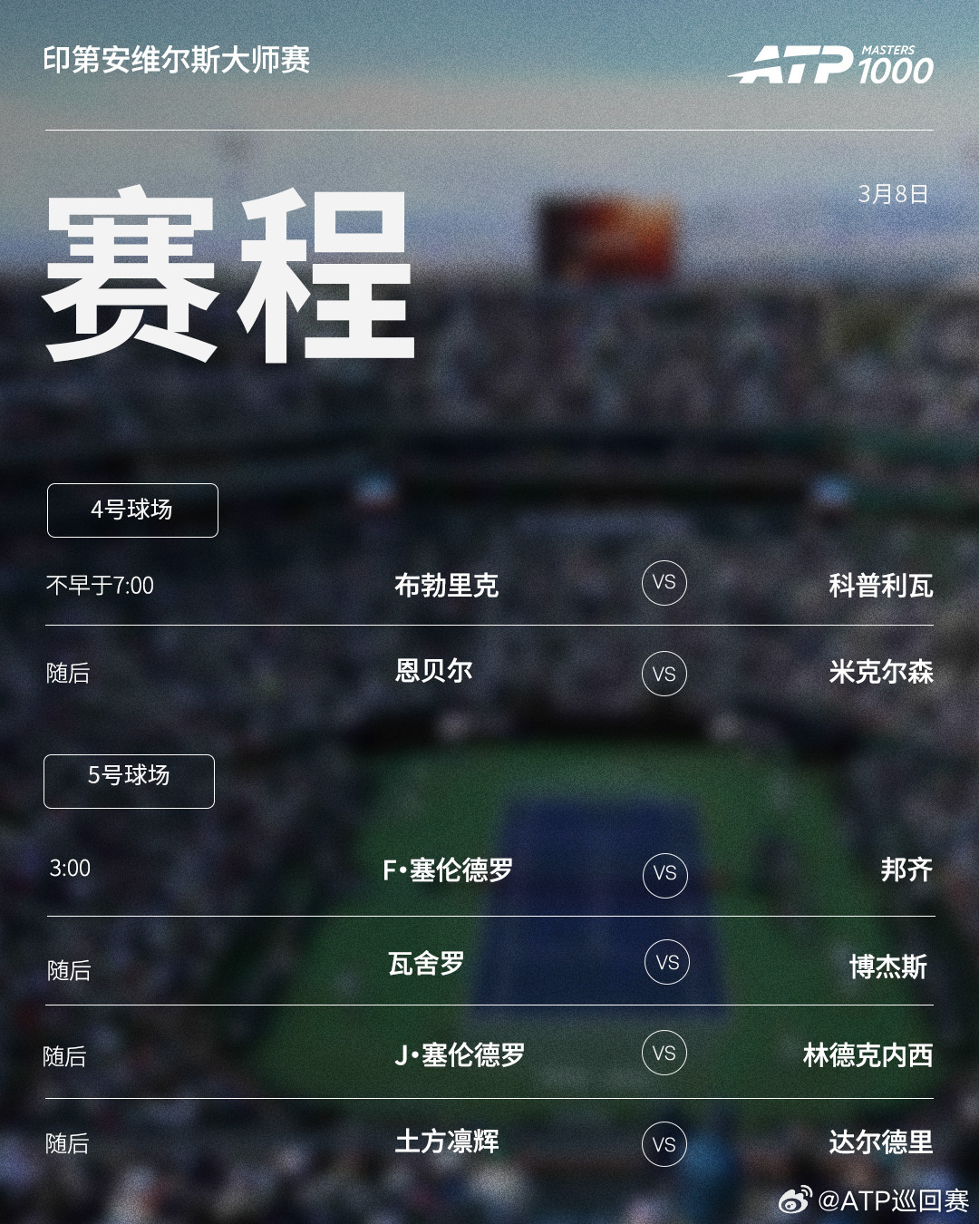 ATP1000 印第安维尔斯大师赛周六将继续第二轮争夺,赛程见图(均为北京时间)👀