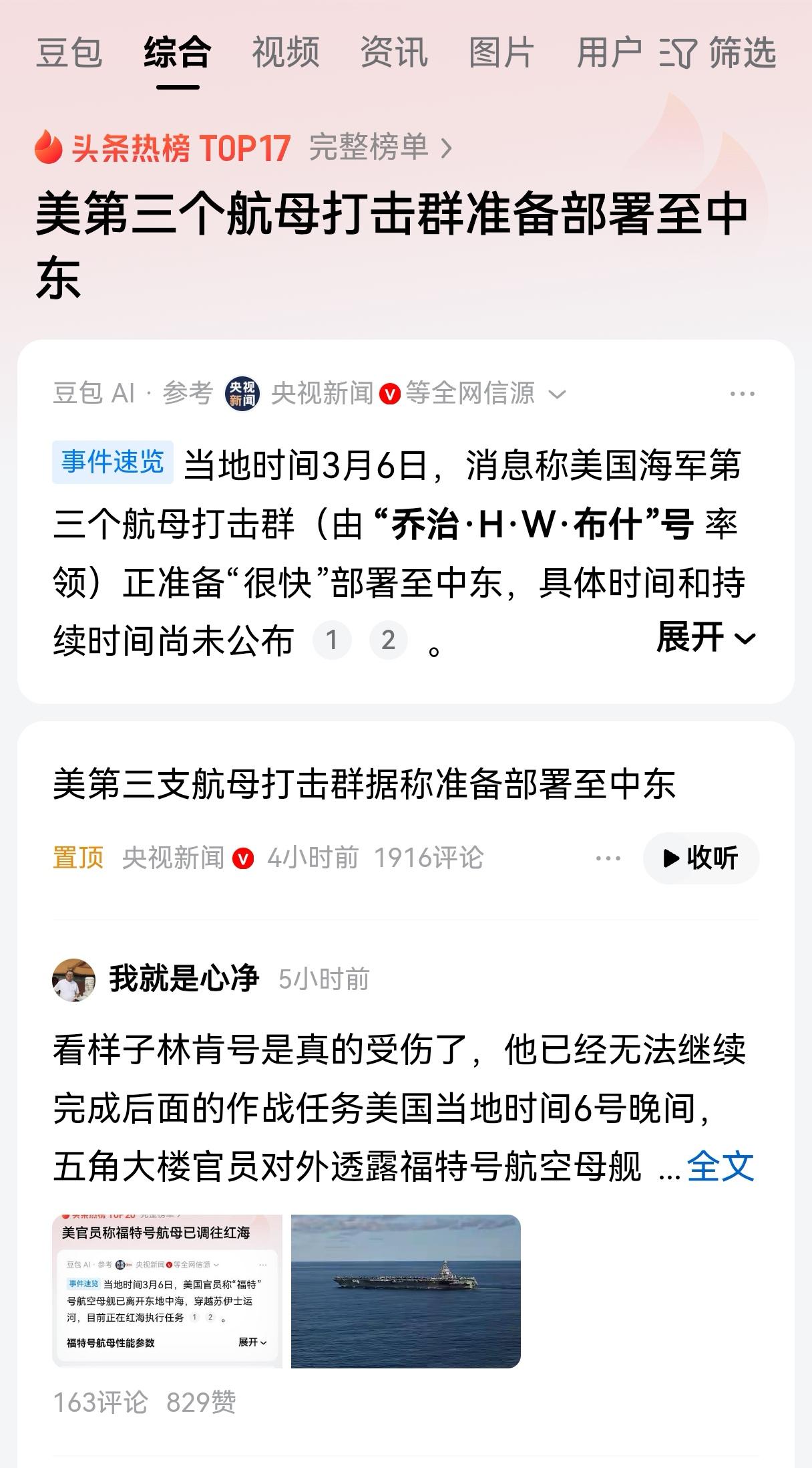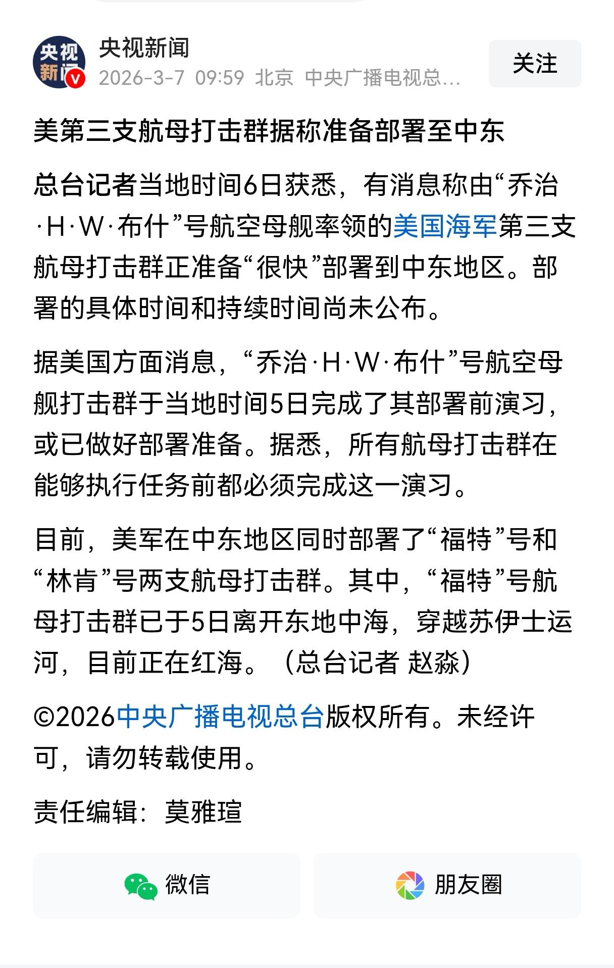 很多事不需要刻意证明,因为自有别的信息印证。 美派第三个航母打击群到中东,印证林肯号航母真的被伊朗击中!如果老美航母都健在,何必多此一举浪费钱财? 虽然老美在否认,但没有人相信。尽管很多人觉得伊朗不太行,但它真的能击中。 这说明什么?说明伊朗没有外界认为的那么弱,老美也没有外界认为的那么强。
