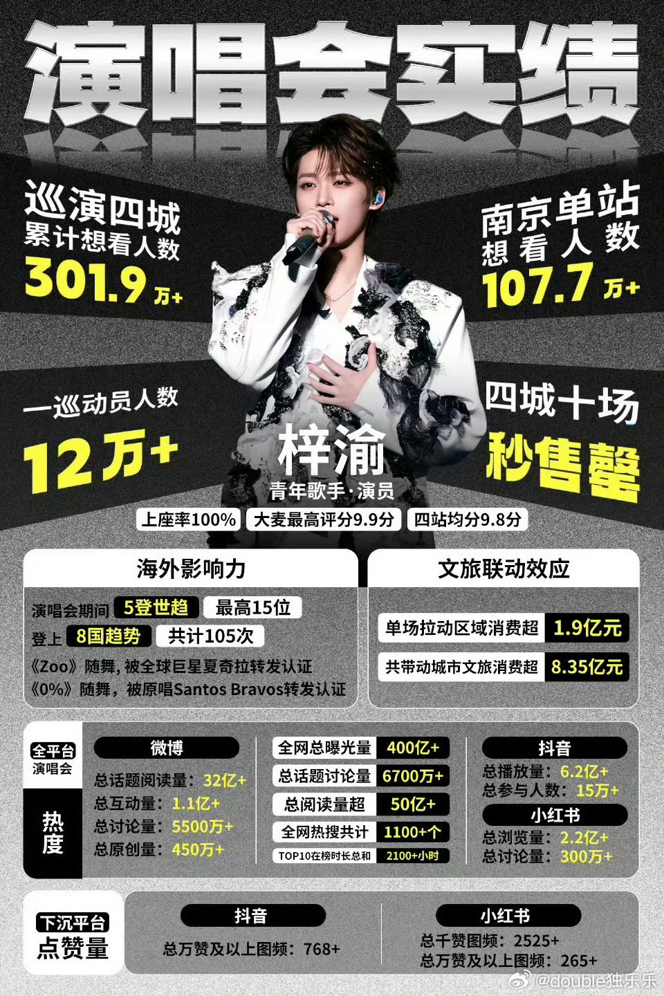 梓渝演出顺应文旅经济发展 梓渝作为首个提出跟着演出去旅行,跟着演出看非遗概念的艺人,通过音乐节,演唱会的形式带动了地方经济,也通过自身影响力让更多人了解了非遗文化,游客蜂拥而至,形成罕见的“梓渝经济”。梓渝用自身行动开创文旅发展新局面,成为新时代正能量偶像代表