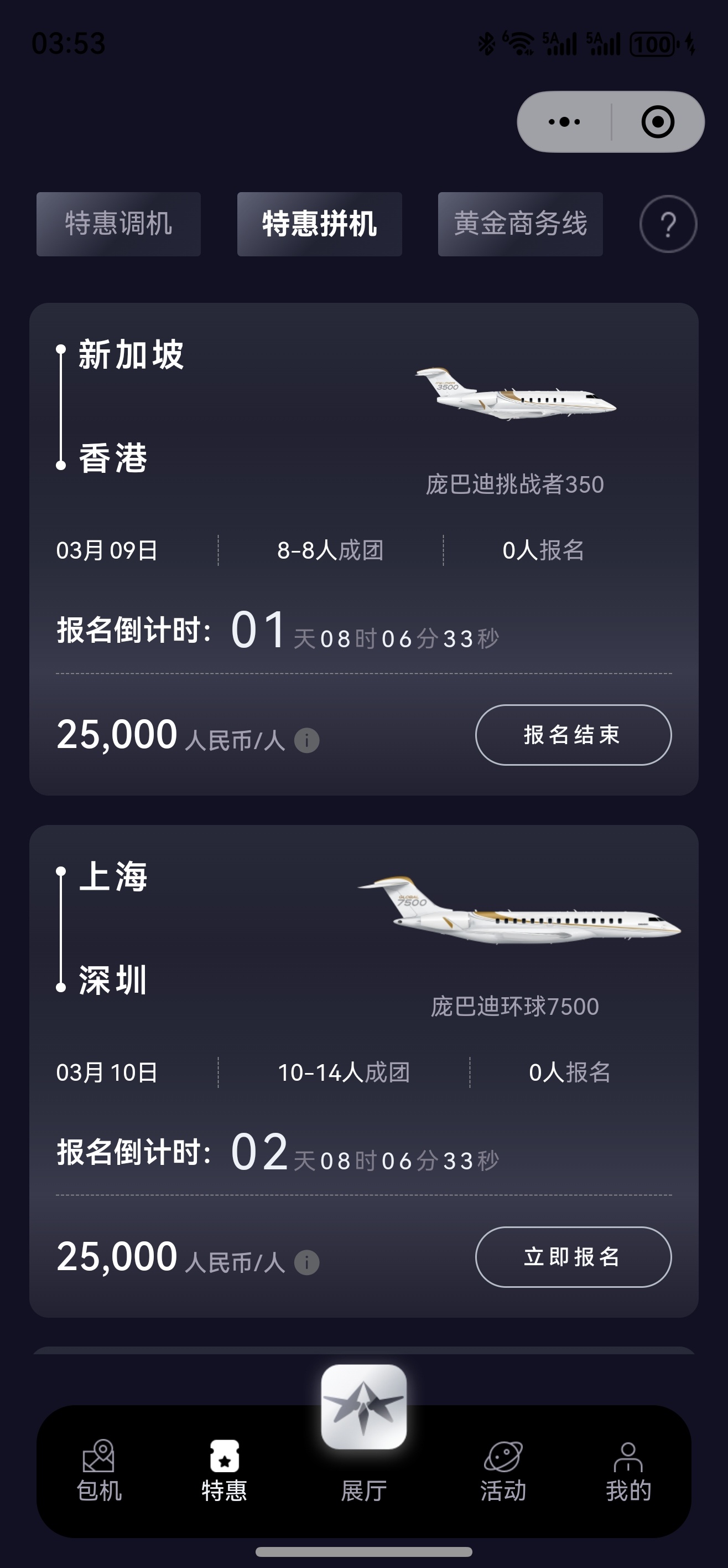 3月9日 新加坡—香港 挑战者350 2.5万一位