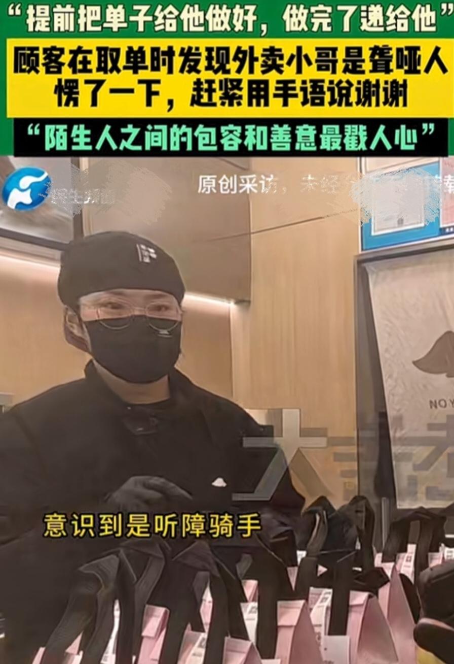 善心接力!2月26日,河南郑州,年轻骑手来到商家取餐窗口,工作人员意识到骑手是听障人士,非常热情地帮骑手找餐。骑手连忙用手语表示感谢。骑手到地后将外卖递给顾客,又用手语表示“用餐愉快”。顾客觉得这个听障骑手太不容易,心地善良的他在后台打赏了200多块钱。 河南郑州,一位顾客在收到外卖后,没有立刻用餐,而是打开外卖平台后台,毫不犹豫地给骑手打赏了200多块钱。 看着手机屏幕上骑手离开时的背影,顾客心里满是动容,没人知道,这个看似普通的骑手,是一位听障人士,而他全程的温柔与善良,都藏在无声的动作里。 这场暖心的相遇,始于一个普通的送餐午后。一位年轻的骑手,穿着骑手服,戴着头盔,骑着电动车,准时来到一家商家的取餐窗口前。 他停下车子,快步走到窗口,没有像其他骑手那样大声喊取餐,只是静静地站在原地,手里拿着手机,屏幕上显示着取餐码,眼神里带着几分腼腆和拘谨。 工作人员很快反应过来,这位骑手大概率是听障人士,无法正常交流,只能通过手机和手势表达自己的需求。 没有丝毫不耐烦,工作人员一边留意着骑手的动作,一边快速在出餐台寻找对应取餐码的外卖,动作麻利又细心,生怕让骑手多等一秒。 骑手站在窗口前,看着工作人员忙碌的身影,眼神里满是感激。他能感受到工作人员的善意,没有因为他的特殊而怠慢,也没有因为无法交流而不耐烦,这份温暖,让他紧绷的神经渐渐放松下来。 没过多久,工作人员就找到了外卖,仔细核对取餐码后,轻轻将外卖递到骑手手中,还特意拍了拍外卖袋,示意他拿好,脸上依旧带着温柔的笑容。 骑手接过外卖,连忙抬起手,熟练地比出标准的手语,动作轻柔又认真,以此来表达自己的感谢。 工作人员虽然不完全能看懂所有手语,但也明白他的心意,笑着朝他摆了摆手,示意他不用客气,还轻轻指了指远方,提醒他送餐路上注意安全。 骑手点了点头,再次用手语表达谢意后,小心翼翼地将外卖放在电动车的餐箱里,盖好盖子,又回头朝工作人员挥了挥手,才骑着电动车匆匆出发,奔赴送餐目的地。 顾客打开门,看到骑手的瞬间,还有些意外,没想到送餐的骑手这么年轻。骑手没有开口,只是微笑着将外卖递到顾客手中,然后抬起手,再次比出温柔的手语,表达“用餐愉快”的心意,眼神里满是真诚,没有丝毫敷衍。 顾客愣了一下,一开始还没明白骑手的意思,直到看到他熟练的手语动作,又留意到他始终没有开口,才恍然大悟,原来这位骑手是听障人士。看着骑手真诚的笑容和温柔的手语,顾客心里瞬间涌上一股暖流,也多了几分心疼。 他能想象到,一位听障人士,从事骑手这份工作,要比普通人艰难得多。无法听到订单提示音,无法和商家、顾客正常交流,只能靠手机和手势沟通,送餐路上还要时刻留意路况,避免发生意外,这份坚持和认真,让人动容。 骑手递完外卖,没有多做停留,朝顾客点了点头,转身就准备离开,依旧是温柔又腼腆的模样。看着他匆匆离去的背影,顾客心里越发不是滋味,思索片刻后,他立刻打开外卖平台,在后台找到骑手的信息,直接给骑手打赏了200多块钱,以此来表达自己的敬意和心疼。 这位听障骑手,没有因为自身的缺陷而自卑,反而用认真和负责,对待每一份订单,用温柔和善意,对待每一个人。他用无声的行动,证明了自己的价值,也温暖了身边的人。 对此,你们有什么看法,欢迎评论留言~