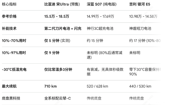 一张图让你看懂宋Ultra相较于同级优势在哪里? 宋Ultra这次预售15.5万,最狠的就是把原本属于仰望、腾势这种豪车的“闪充”技术直接下放了。现在用宋Ultra跟现在的热门对手深蓝S07、银河E5做了个对比,你看完就明白这15.5万值在哪了? 为什么说宋Ultra是在“掀桌子”? 它解决了“最后20%”的尴尬: 不管是深蓝还是银河,大家以前宣传的都是“30%充到80%”只要十几分钟。但最烦人的是最后那20%,往往要等半天。宋Ultra这次牛在“9分钟充饱”,它是全过程不减速,这在目前15万级市场是独一份。 它是真正的“抗冻神器”: 以前北方冬天充电是噩梦。宋Ultra在零下30℃充到97%也就12分钟左右。对比之下,虽然银河E5的短刀电池也耐低温,但在补能纯速度上,宋Ultra这次确实快了一个身位。 大空间+高智驾: 2840mm的轴距比深蓝和银河都要大一圈,空间感更强。而且它可选装天神之眼5.0(激光雷达),虽然选装要9900元,但在这个价位段能给激光雷达,诚意已经很足了。 一句话建议: 如果你追求极致省心,不想在服务区排队太久,或者人在北方,那宋Ultra绝对值得你多等半个月到3月底正式上市。