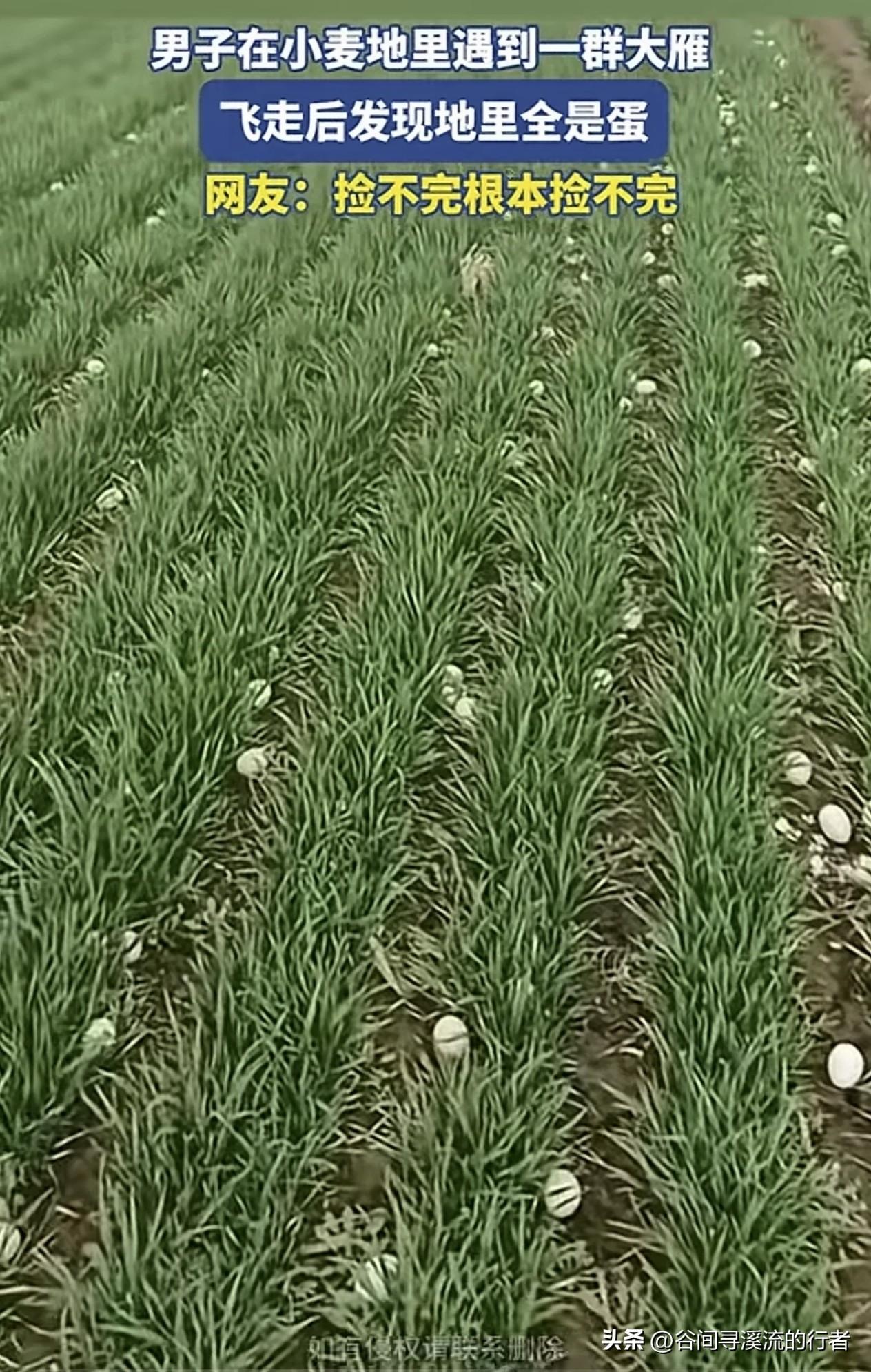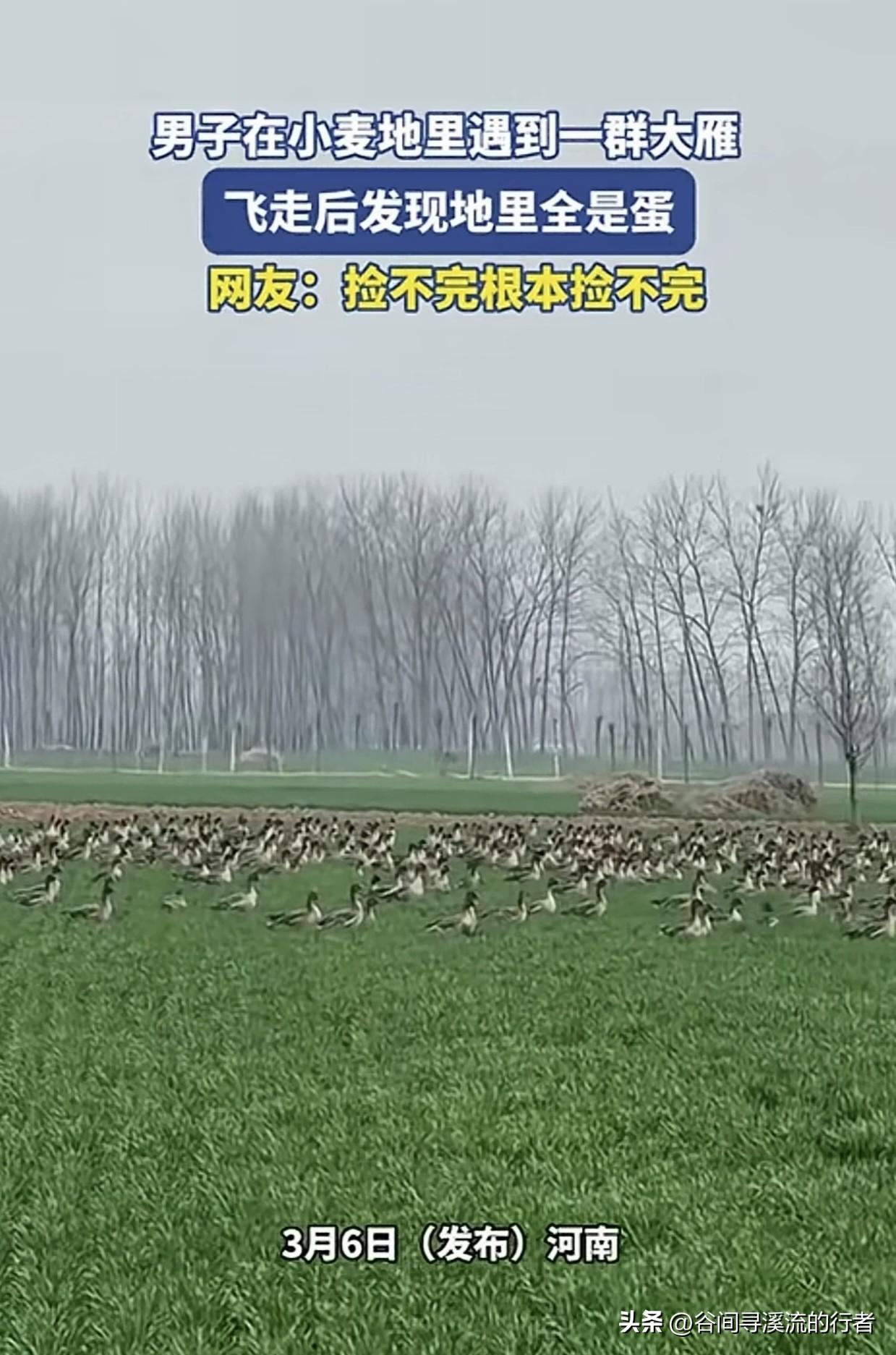 一群大雁落在麦地里,不走了。 起初,主人以为是过路的鸟群歇脚。可它们低下头,伏在麦垄间,竟像一群归巢的母鸡——集体产卵。 这是一幅多么宏伟而又奇异的景象:灰褐色的羽毛在夕阳下泛着油亮的光,它们安详地蹲着,每一只身下都护着一枚青灰色的蛋。 主人站在田埂上,被这突如其来的馈赠整不会了。 就在主人查看咋回事的时候,这些大雁集体飞走了,留下一地的雁蛋。 自己家地里这些蛋能捡吗?