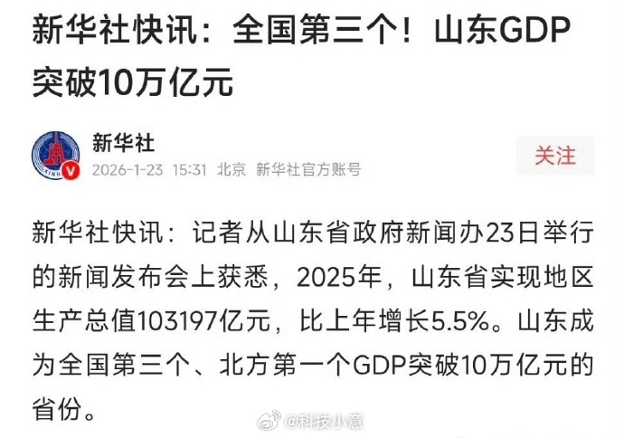 刚刚过去的一年,山东经济跑出了北方大省的加速度。根据官方数据显示,山东全省GDP历史性突破十万亿大关,达到 103197亿元,增速5.5%。这不光是一个数字的突破,更是山东作为北方地区首个10万亿大省,高质量发展的十足底气。