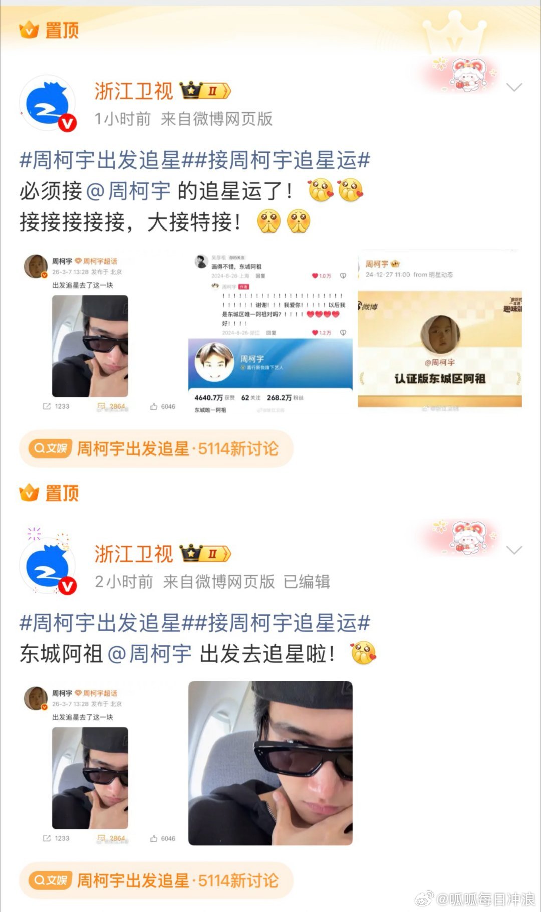 周柯宇今天出发录新综艺,浙江卫视官博置顶和背景图都换成了周柯宇~这波排面拉满了