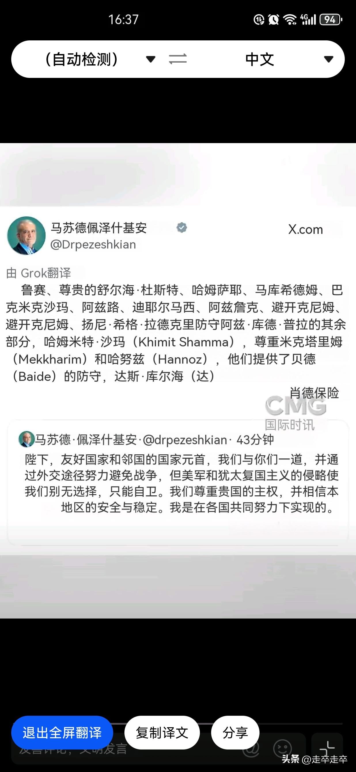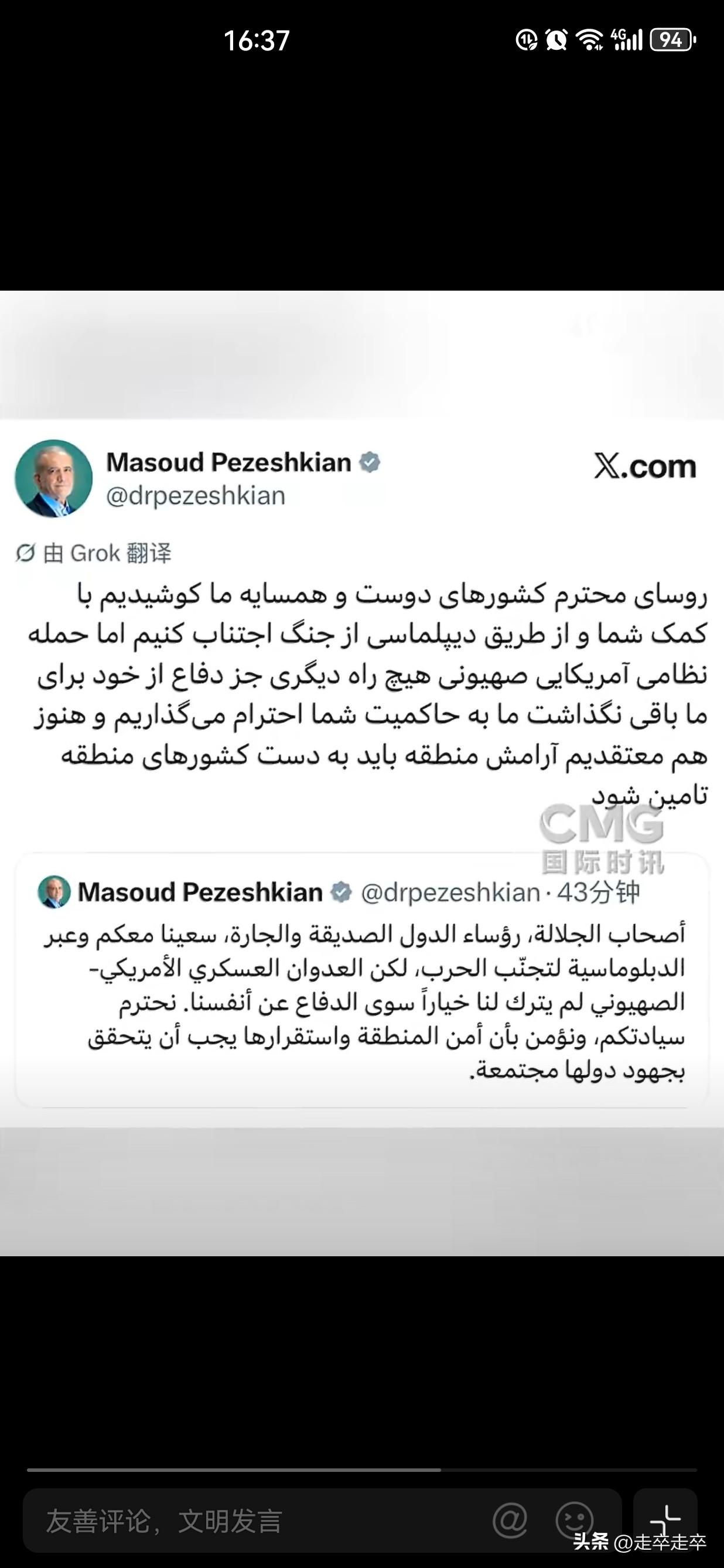 这还是“波斯猫”吗?有些“上兵伐谋”的意思了! 3月4日伊朗总统佩泽希齐扬通过社交媒体以阿拉伯语和波斯语双语发文,向海湾国家解释伊朗的军事行动为“被迫自卫”。接着他还表示感谢周边的邻国,因为伊朗曾借助邻国外交努力来避免战争。宣布伊朗“不再攻击邻国或发射导弹”,除非邻国首先对伊朗发动攻击。 佩泽希齐扬此番表态意在缓和与阿拉伯邻国的紧张关系,避免在对抗美以时陷入孤立。其措辞既为伊朗反击行动寻求合法性,又试图安抚对地区冲突升级深感忧虑的逊尼派国家,折射出德黑兰在抵抗轴心,战略与地区外交间的微妙平衡。 佩泽希齐扬的表态是伊朗的危机管理策略,用“自卫权”合理化对美以的反击,同时通过道歉降低地区冲突风险。