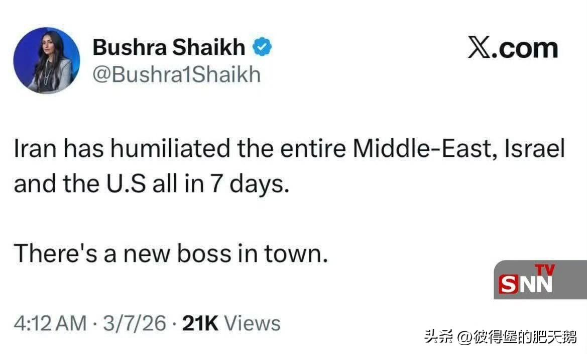 伊朗在过去七天内羞辱了整个中东、以色列和美国。 英国广播公司主持人的推文写道: 伊朗在七天内羞辱了整个中东、以色列和美国。 (中东)这座城市有了新老大。 不得不说,英国媒体最擅长的就是拱火。 #海外新鲜事# #热点观点# #美伊以冲突#
