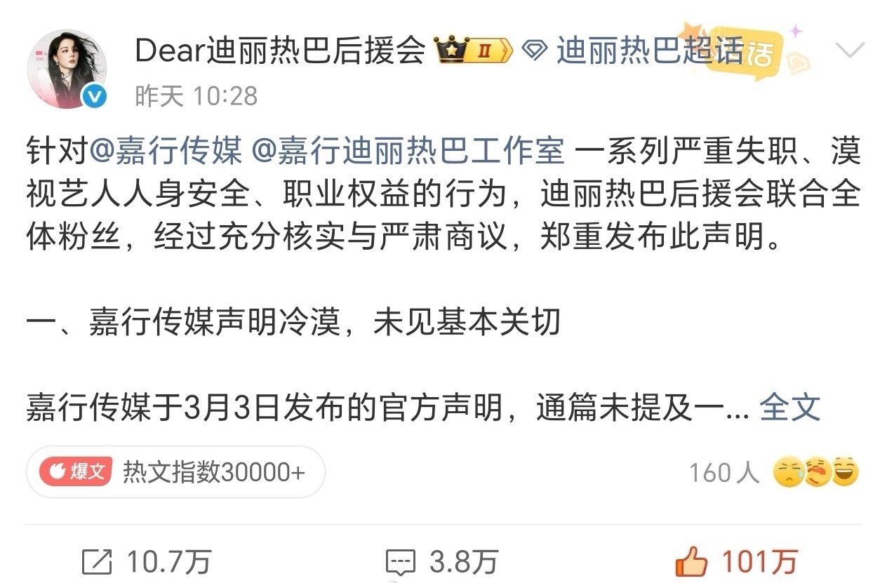 迪丽热巴家发起的维权相关博文点赞量都破百万了,但嘉行依旧不给任何回应。