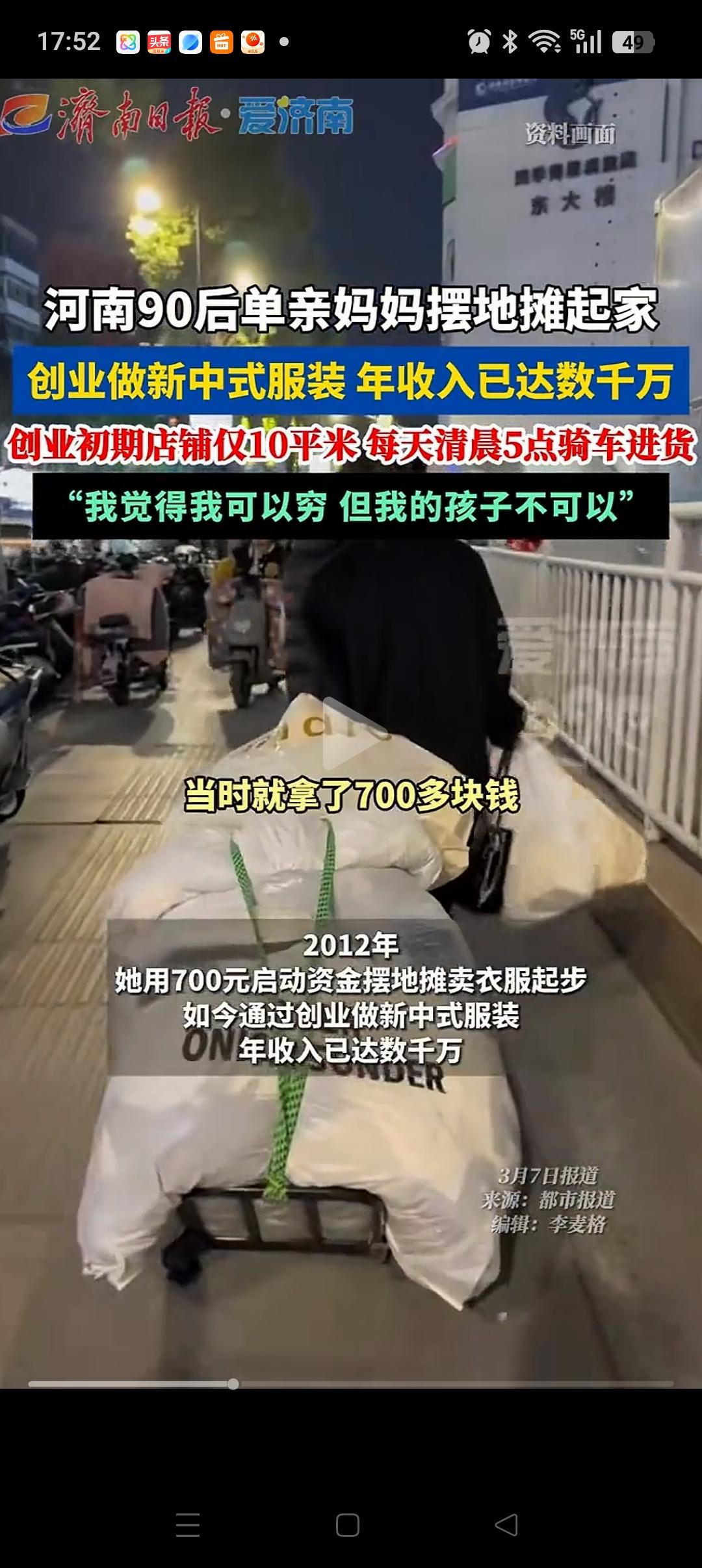 “太励志了”,河南郑州,女子离了婚,独自带着孩子,拿着仅有的700块钱,就开始了摆摊之路。如今的她已经小有成就,公司营收一年差不多可以达到几千万,而她今年的目标则是一个亿。 谈到以前,她表示太辛苦了,每天只能睡几个小时,凌晨5点就要骑车去进货。 她卖的衣服是新中式女装,宝妈是她最大的客户人群,年轻人相对穿的较少。所以她接受采访时,强调自己是单身妈妈,一路走来很辛苦。更多的是想获得宝妈的好感,信任,多卖点衣服。 虽然有很多人对她讲的话有一些质疑,但我觉得她说的是实话。2012年时做生意的门槛还是比较低的,有很多人都是靠几百块钱发家的,不足为怪。 但是希望她不要强调自己是“单身妈妈”,有点多此一举。。