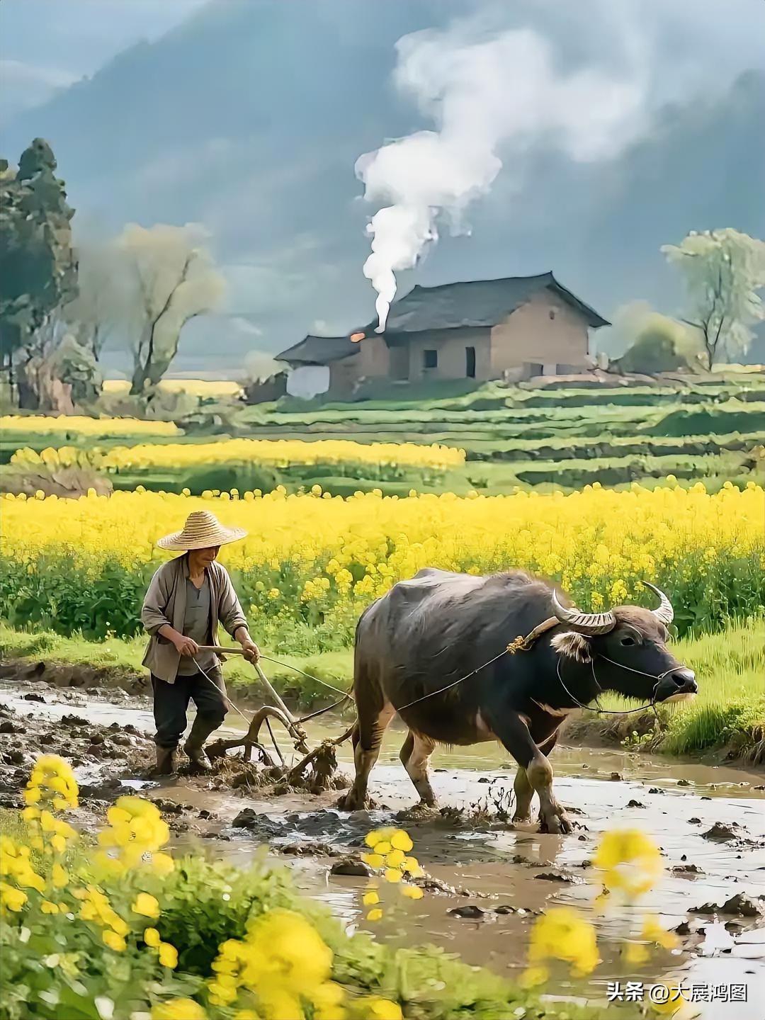 田间辛勤劳作,黄牛奋力犁地,尽显乡村生活的宁静与美好。田园劳作照牛耕田图田里