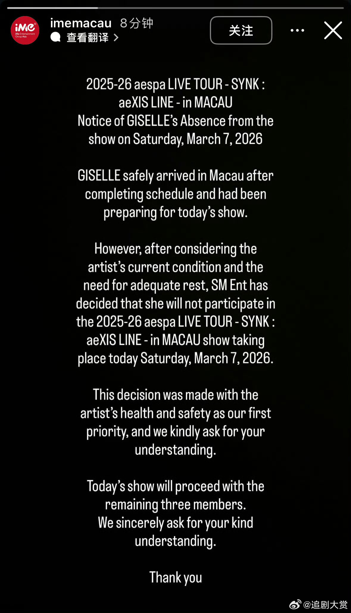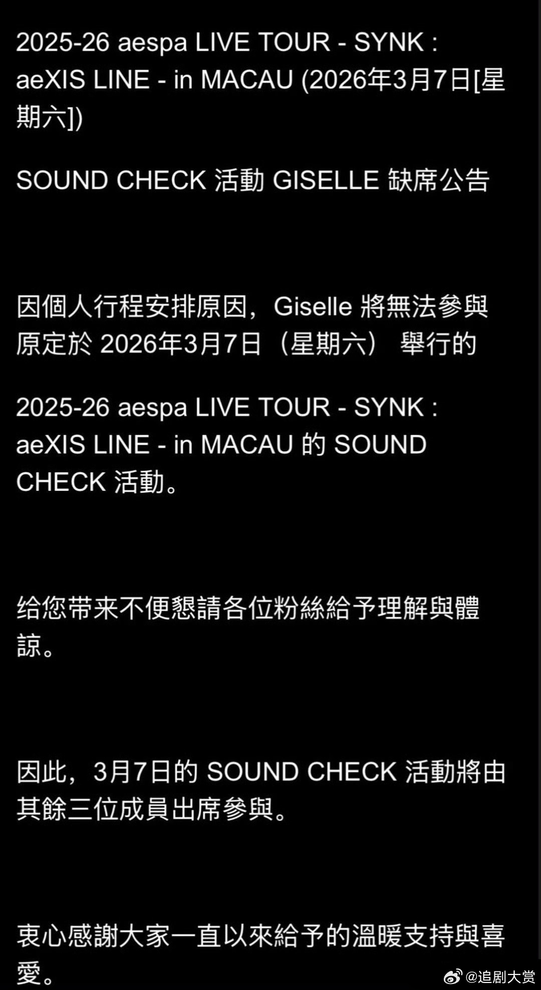 吉赛尔缺席aespa澳门演唱会吉赛尔缺席aespa3月7号澳门演唱会,彩排试音