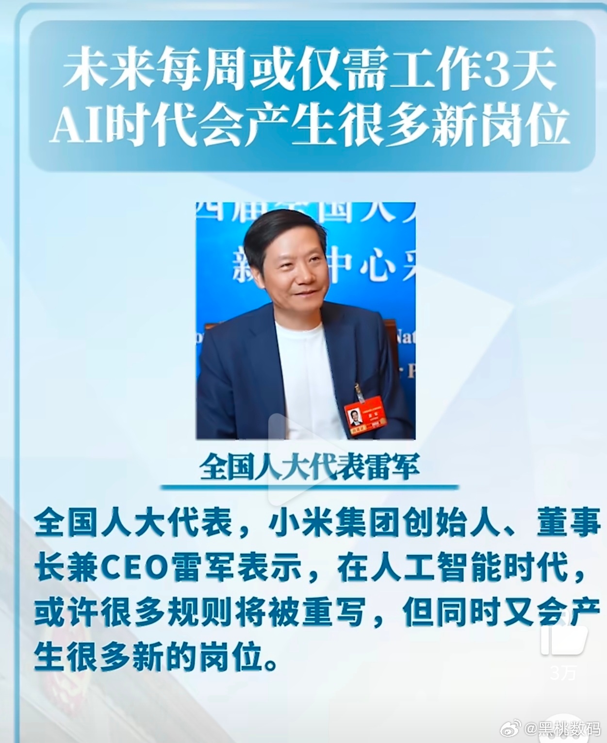 雷军说未来每周或仅需工作3天小米创始人雷总近期谈到未来我们将在AI的助力下,我们的工作效率会提高很多,有可能不用每周工作五天,每周工作三天就够了。但是我现在根本不敢想这些东西,我只想现在可以先把双休日以及不要无偿加班先普及了,这才是现阶段社会最需要解决的事情。