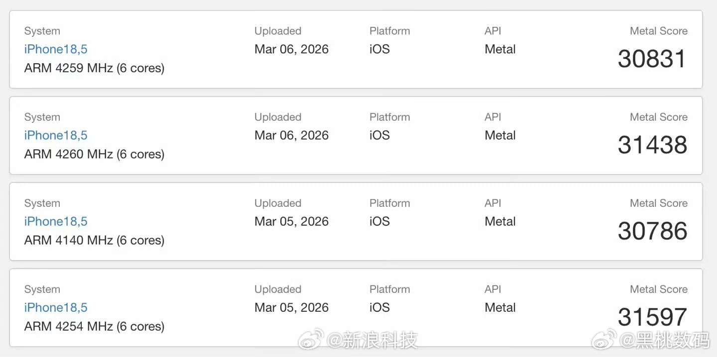 iPhone17e跑分出炉iPhone 17e的Geekbench跑分数据现已曝光,其搭载的阉割版A19芯片,CPU核心规格与iPhone 17标准版一致,多核跑分基本持平。但GPU核心缩减至4核,相比标准版少1核,图形性能明显偏弱。实测Metal跑分约31000-31500分,低于标准版的37000分,整体GPU性能弱于iPhone 17。