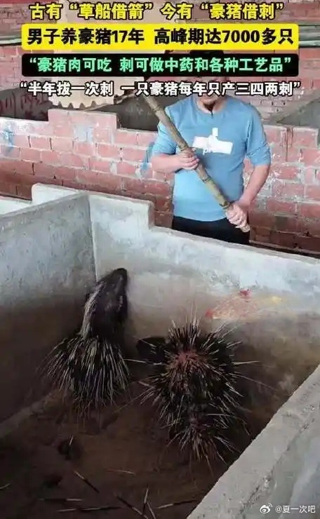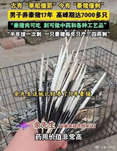 男子养豪猪拔刺一斤能卖400元!男子养豪猪拔刺一斤能卖400元 四川内江余先生养殖豪猪17年,高峰期规模达7000多只,每半年可拔刺一次,每只年产三四两刺,每斤刺售价400元;豪猪肉售价约百元一斤,刺可用于制作工艺品及药用。