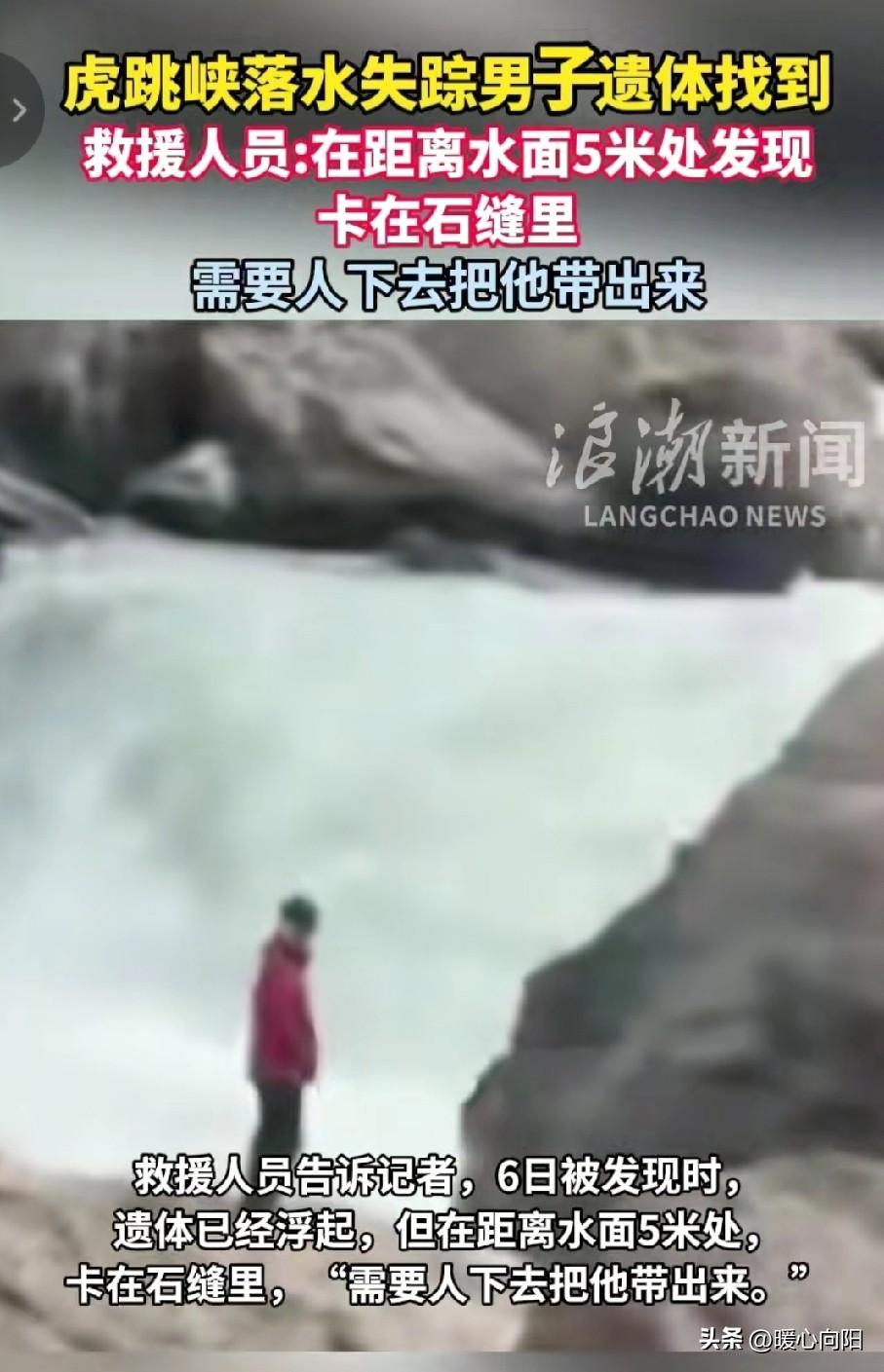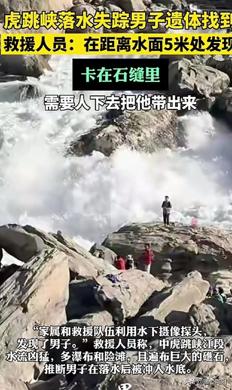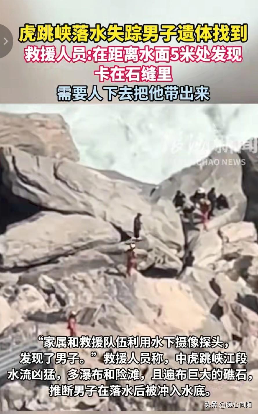 悲痛!在虎跳峡落水的29岁男子遗体被找到了!遗体已经浮起,但在距离水面5米处,卡在石缝里,“需要人下去把他带出来”,目前仍在打捞中。 这名男子叫小杜,他是山东枣庄人,出生于1997年,是一位美术老师。 小杜和女友正在筹备婚礼,这次去云南是拍婚纱照,拍完后,趁着假期想多玩几天,看一看云南美丽的风景! 众所周知,云南的风景一直很美,那里的气候更是四季如春,非常适合大家旅居,也适合年轻人去那里拍婚纱照。 于是在两人拍完婚纱照之后,就选择了著名景点虎跳峡,它位于香格里拉和丽江的交界处,风景很美但也带刺。 2月25日早晨,小杜与女友一起从丽江古城出发,前往虎跳峡徒步,他们来到了中虎跳峡“满天星”,网红打卡点“发疯石”就在这。 春节这几天,每天排队一两个小时,就为了站在石头上拍张“照片”,小杜和女友也在这儿排队。 下午3点45分左右,小杜杯子上沾了点泥,蹲在江边礁石上洗杯子。一起身,脚㡳打滑,直接裁进江里。 女友见壮连忙把登山仗伸向他,小杜手抓住了登山仗,因为水流激,登山仗咔嚓一声断了,小杜被急流冲走了,可惜这个年轻人就这样失去了踪影。 女友哭的撕心裂肺,没想到夲是和男友准备结婚成了愿望。 事发后,多方救援队伍迅速在事发水域和下游展开搜救工作。由于那里水流急,暗礁石多,搜救难度大,以至好几天没有找到。 直到3月6日救援队伍利用水下摄像探头,才发现了男子,遗体已经浮起,但在距离水面5米处,卡在石缝里,“需要人下去把他带出来。”目前仍在打捞中。 据说,这对情侣正准备结婚,请贴己经发去了,就等亲朋好友吃酒席。没想到去云南拍婚纱照,这位男子再也回不来了。让人无比心痛。 通过这件事,大家外出旅游一定要小心谨慎,把安全放在第一位,其他的都是小事,生命才是最重要的。 在此,愿他的家人节哀顺变,化悲痛为力量,好好生活!