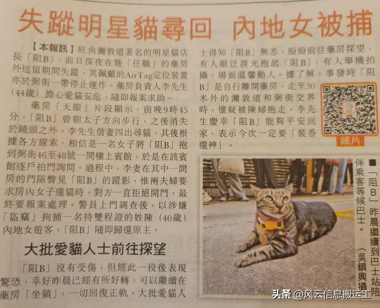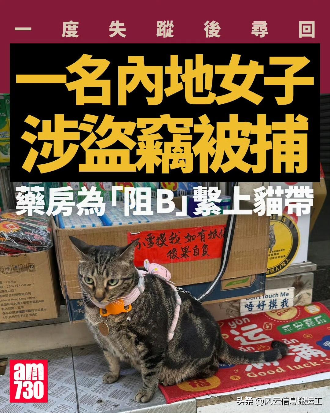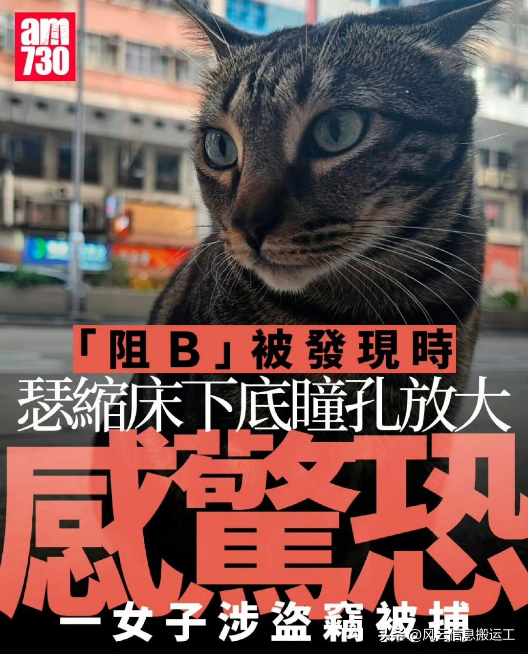 它叫“阻B”,是香港旺角一家药店的猫,整天站在门口车站等车而又不上车,成为明星猫。 3月5日,它突然失踪,药店报警,引起大批网民协助寻找。 最后,通过调查监控,在附近的一家宾馆内找回它。 偷走阻B的是两名操非本地口音广东话的内地游客,她们表示以为阻B是一只流浪猫,所以带走。 其中一名40岁女游客被警方盗窃罪名拘捕。 来源am730