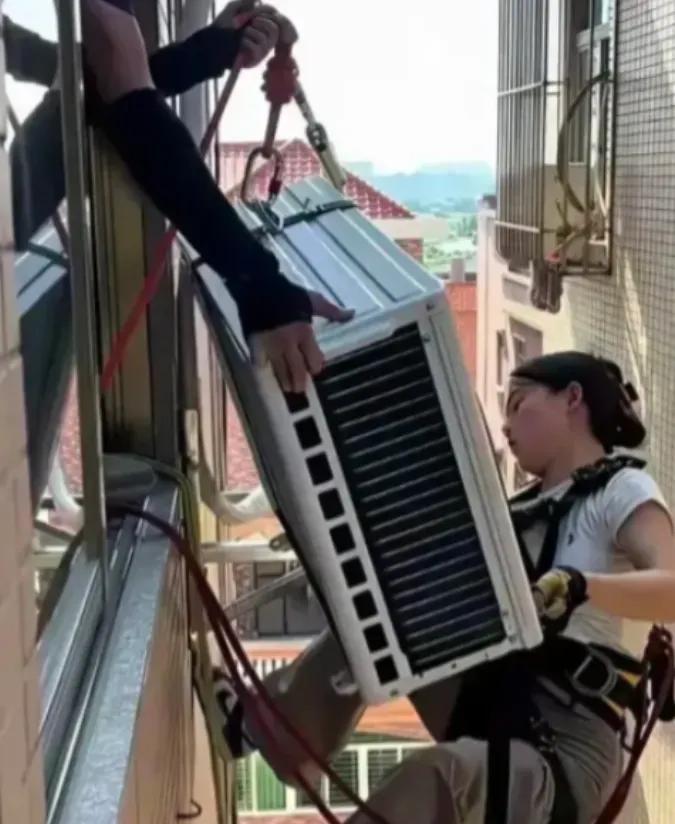 火上人民日报了!广东一男子买了空调,来安装的是一对二十多岁的年轻夫妻。可他万万没想到!女的一上来就绑上绳子就爬到窗外,钻孔、装支架,整个过程无比熟练。 屋主全程站在窗边紧盯,手心都攥出了汗。他原本以为女孩只是打下手,递递工具、整理线材,没想到她才是负责高空作业的主力。女孩仔细检查好双重安全绳,和丈夫一起固定好室内锚点,翻身爬出窗外的动作一点都不拖沓。几十米的高空上,她单脚踩在支架位置,一只手扶墙稳住身体,另一只手拿着电钻钻孔,装支架、拧螺丝,整套动作一气呵成。屋内的丈夫全程拉紧防护绳,精准递上配件,两人搭档多年,一个眼神就配合得十分默契。这段实拍视频发布后很快刷屏,人民日报也转发点赞,无数网友都被这对年轻人深深打动。 这对95后夫妻来自周边农村,结婚之后就一起干起了空调安装。女孩主动学习高空作业,没有任何捷径,全靠日复一日的实操练习。从绑绳规范到钻孔精度,一遍遍打磨,才有了如今的熟练程度。夫妻搭档是最务实的选择,夏季空调安装订单爆满,单人根本忙不过来。家人结伴干活,既能提升效率,也能时刻紧盯彼此安全,比和外人搭档多了一份安心。他们没有固定底薪,收入全靠计件结算,旺季每天凌晨5点出门,深夜收工是常态,一天最多安装十余台空调。扛着数十斤的外机爬楼、悬空作业,早已成为他们的生活日常。 空调安装是国家认定的高危特种作业,2米以上外墙操作必须持有高空作业证。这个行业风险很高,每年夏天都有安装工因安全防护不足、操作不规范发生意外,一根安全绳就是他们全部的保障。在这个行业里大家都清楚,安装工普遍有腰肌劳损、关节损伤等职业病,这份工作吃的是青春饭,大多数人过了35岁,就难以承受高强度作业。女性从业者少之又少,不是没人愿意尝试,而是体力与心理的双重考验,足以劝退绝大多数人。 网友的热议里,满是心疼与敬佩,但也有人带着固有的刻板印象。不少人觉得年轻女孩不该从事这么危险的体力活,应该选择更轻松的工作。其实这就是对职业、对性别的偏见。我们总爱给工作划分高低,给性别设定边界,却忘了最朴素的道理:合法劳动不分尊卑,靠自己双手挣钱最值得骄傲。这对夫妻不啃老、不躺平,不投机取巧,用汗水换取安稳生活,这份踏实的奋斗,远胜于空谈理想、眼高手低的浮躁做派。 他们的心愿很简单,攒钱买房,给家人安稳的生活,没有宏大的口号,只有一步一个脚印的坚持。每一次系上安全绳,他们想的不是博取关注,而是保质保量完成安装,守住职业底线。在当下追求快流量、快收益的环境里,这对年轻人坚守在最辛苦的岗位上,用最平凡的坚守,诠释了普通人的奋斗价值。 当下空调安装行业还有不少短板,无证上岗、安全规范落实不到位、劳动者保障不完善等情况依然存在。我们在为这对夫妻点赞的同时,更要关注全体体力劳动者,完善安全监管体系,提升薪资与福利保障,打破职业偏见。每一个认真生活、努力打拼的普通人,都理应被看见、被善待,脚踏实地的劳动,永远是社会最坚实的底色。 各位读者你们怎么看?欢迎在评论区讨论