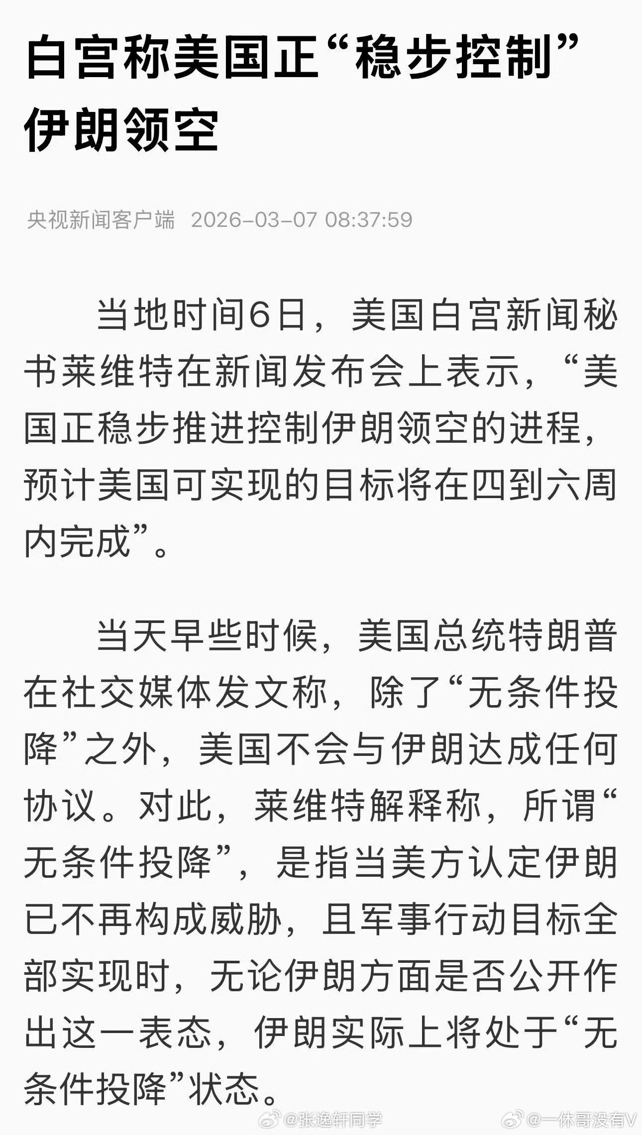 白宫新闻秘书莱维特表示,特朗普自己将判断伊朗何时"无条件投降"。她解释说,当他认定伊朗不再对美国构成威胁,并且美军行动的目标已完全实现时,无论伊朗自身是否承认,实际上都将处于无条件投降的状态。无条件投降的单方面认为是否结束,赢,真笑话