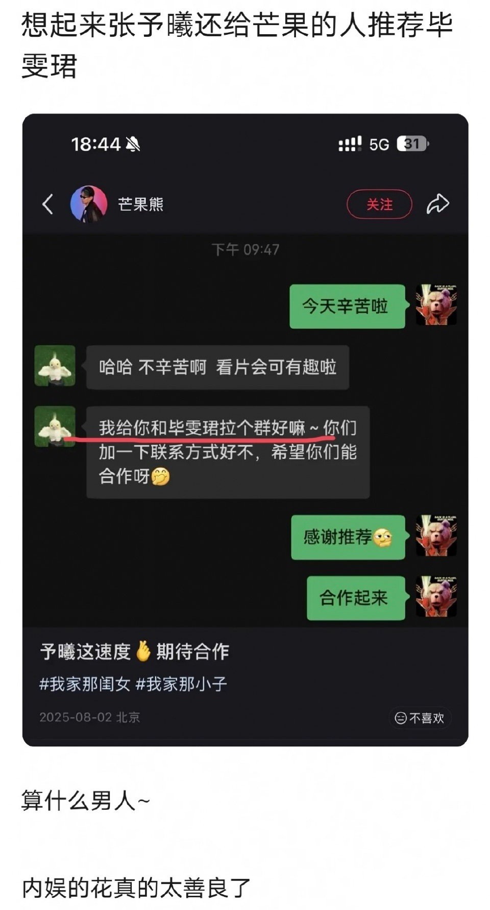 毕雯珺发卖cpf被麻辣了。1.《深情眼》杀青一周年,与张予曦合体录综艺售后被热议2. 毕雯珺在粉丝群安抚粉丝,说自己不够强大,工作中有很多不可控情况发生3. 现在两人cpf吐槽毕雯珺白莲4. 网友发现张予曦在《深情眼》播完还给毕雯珺介绍工作,直呼张予曦善良
