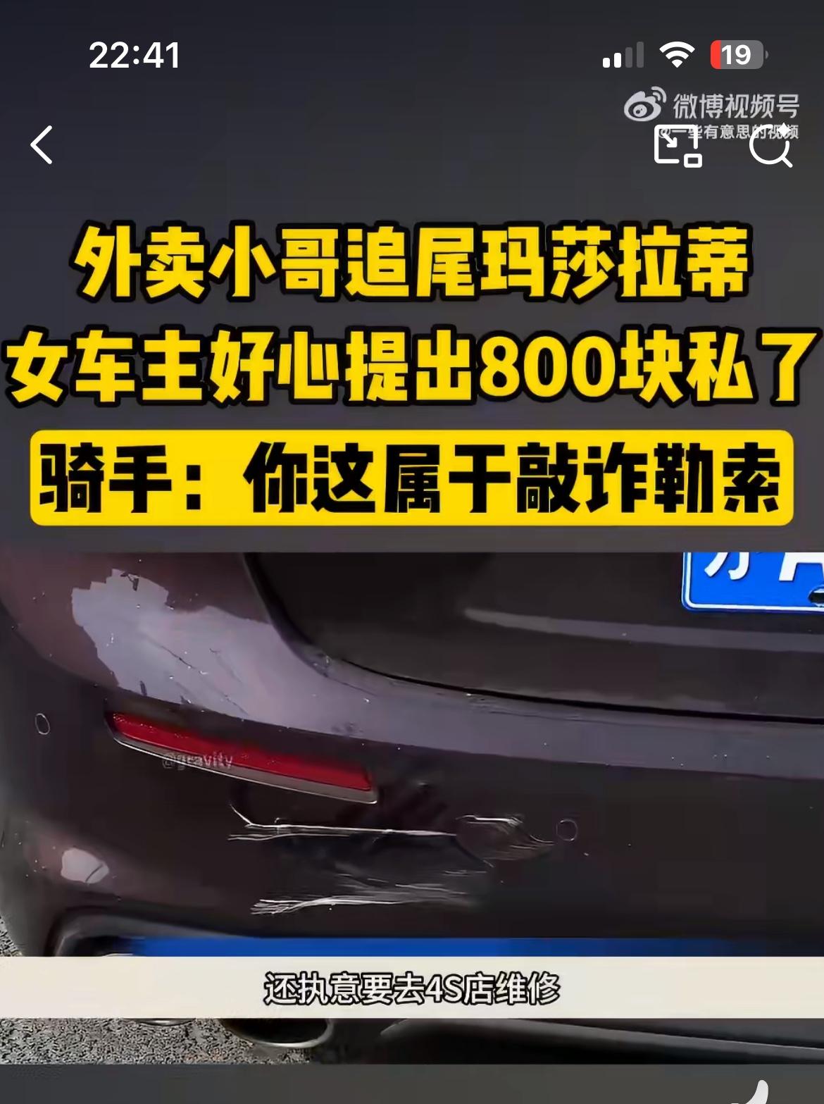 外卖小哥骑车追尾玛莎拉蒂,女司机见他不容易,好心提出800块私了,结果外卖小哥不但不领情,还严厉指责女司机敲竹杠。司机无奈只能报警,交警根据行车轨迹判定外卖小哥全责,小哥当场不服,质问为什么是他全责。因为交警已经定责,女司机也不再跟他纠缠,直接把车送去4S店维修,最后定损费用一共一万二。看到账单那一刻,外卖小哥彻底傻眼了。真是早知如此,何必当初呢。送外卖事故