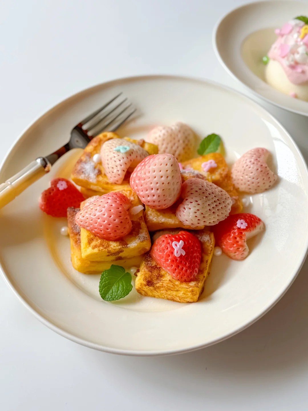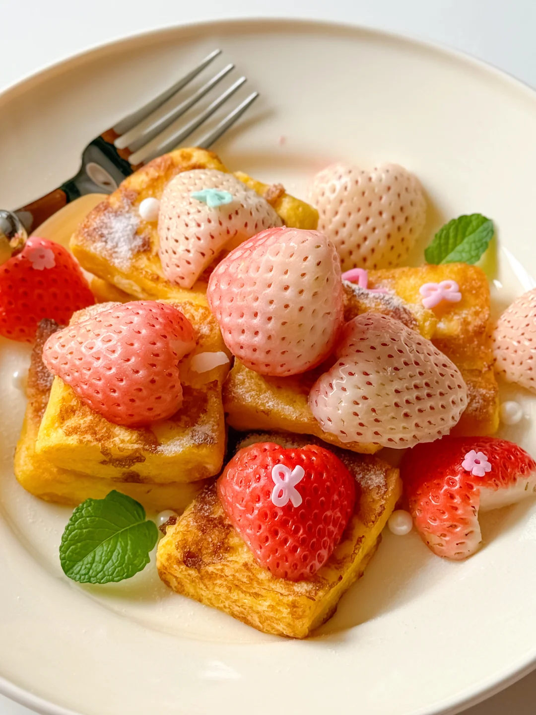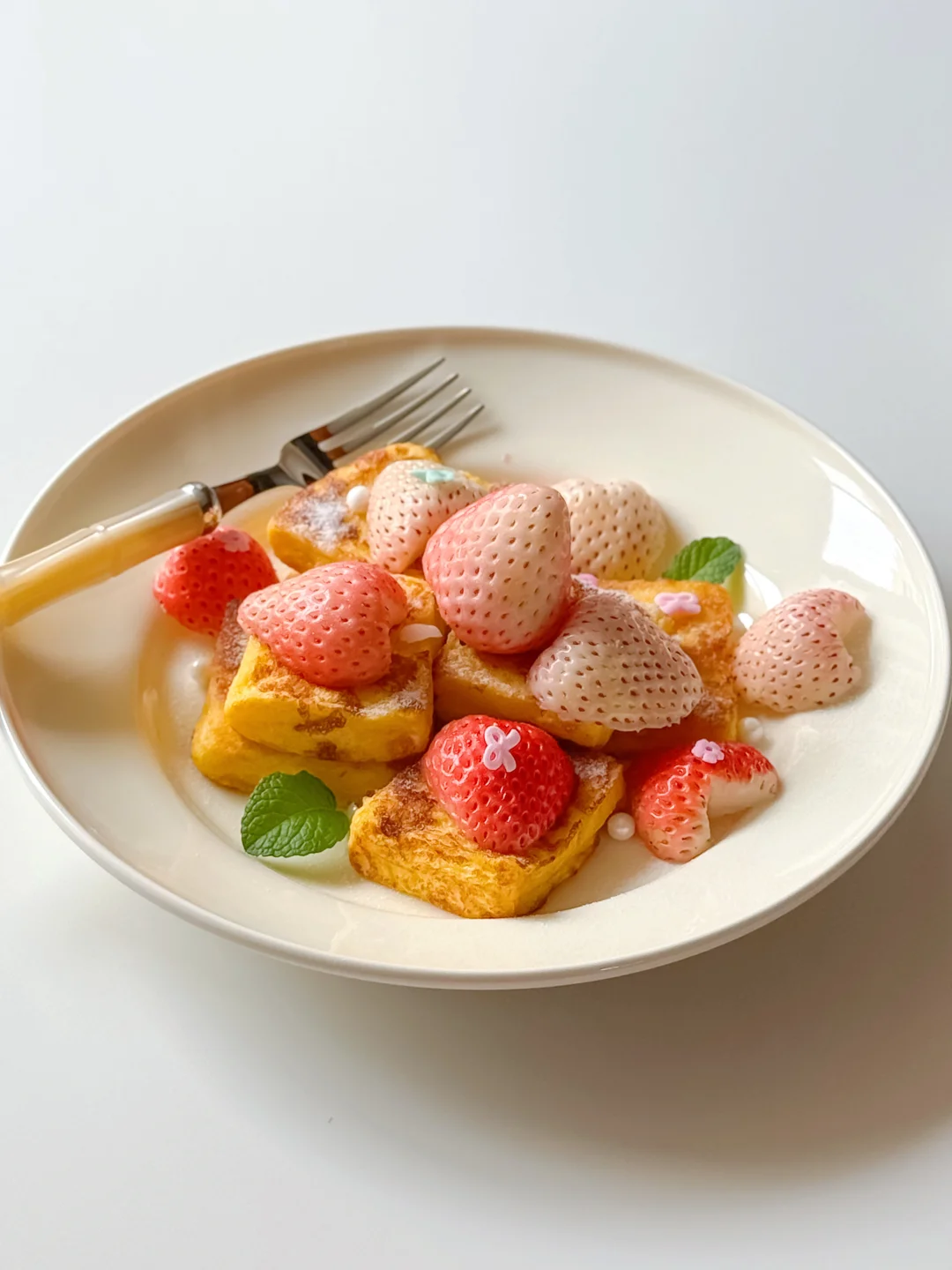 茶餐厅味在家复刻, 外酥里嫩还爆浆,早餐/下午茶都拿捏。 【食材】 厚吐司 2片|鸡蛋 2个|牛奶少许 花生酱 适量|糖粉 草莓🍓,水果随意搭配。 【做法】 1. 吐司去边切四小块,两片夹花生酱压紧 2. 鸡蛋+牛奶搅匀,吐司六面浸满蛋液(约10秒) 3. 热锅刷油,中小火煎至六面金黄 4. 出锅撒上糖粉。配水果开吃