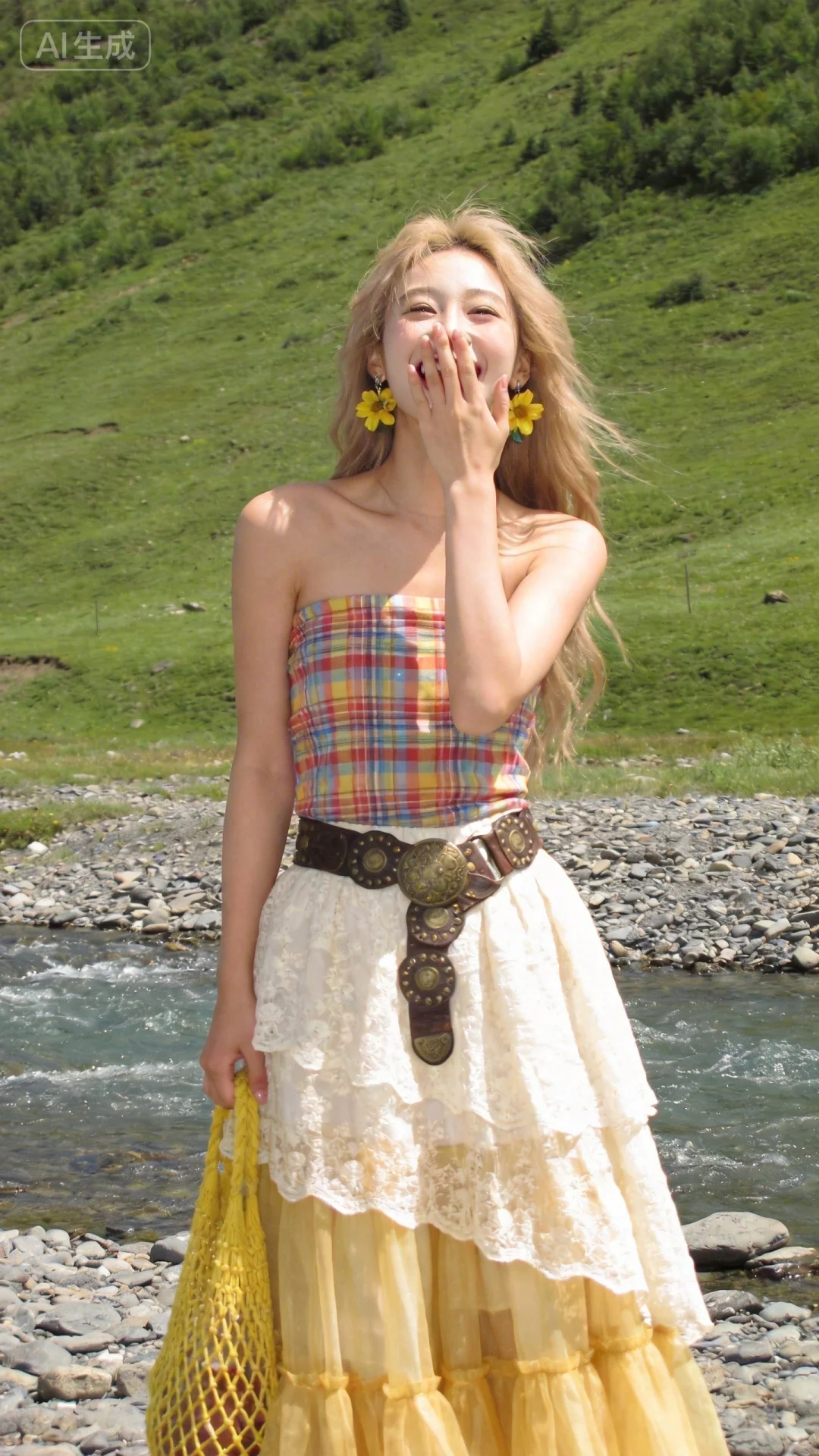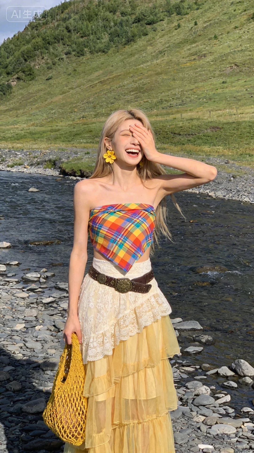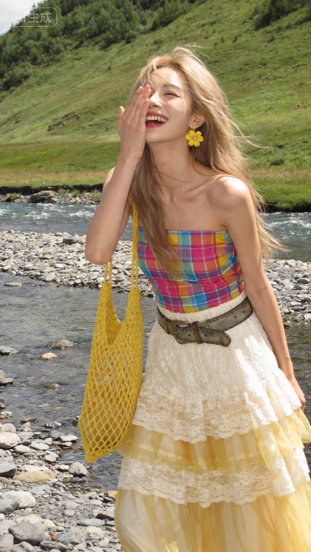 提示词:可爱甜美的女生,在自然清新的河边草原场景(潺潺溪流、布满碎石的河岸、绿意山坡)中,留着浅金色长发。身着彩色格纹抹胸上衣(色彩鲜艳明快,质感挺括有设计感),搭配米白色蕾丝与黄色纱质拼接的多层长裙(蕾丝精致细腻,纱质轻盈飘逸),腰间系着复古风皮带,手持黄色编织网袋(纹理粗犷有手工感),耳饰为黄色花朵造型(甜美吸睛)。肢体动作协调自然,一手掩面大笑,姿态活泼有感染力。脸部神态表情细节自然不失真,笑容灿烂治愈,情绪生动饱满。阴影光线自然柔和,是户外自然光的均匀照射,采用平视拍摄视角,突出人物与自然场景的融合感,整体画面风格浪漫复古,充满自由烂漫的波西米亚气息,服装质感细节清晰,营造出随性惬意的户外出游氛围。一张非常普通的iPhone拍摄,没有清晰的主体,19岁漂亮网红气质的女生,高鼻梁,整体瘦瘦的,也没有构图感,只是一张随意抓拍的照片。这张照片存在轻微的运动模糊,且因阳光不均问题,还有轻微的过曝现象。阳光透过发丝照在脸上,突出自然的肌肤状态,整体神态灵动又不失随性。唯美的氛围感。写实摄影风格,非商业修图,保留轻微的噪点,高光不过曝,阴影有细节,表情平静,眼神很自然不失真(看镜头或不看镜头),呈现出慵懒松弛悠闲的状态感觉,很贴近生活写实的照片(权威)。氛围感,情绪片,CCD拍摄,大师作品,柔光滤镜