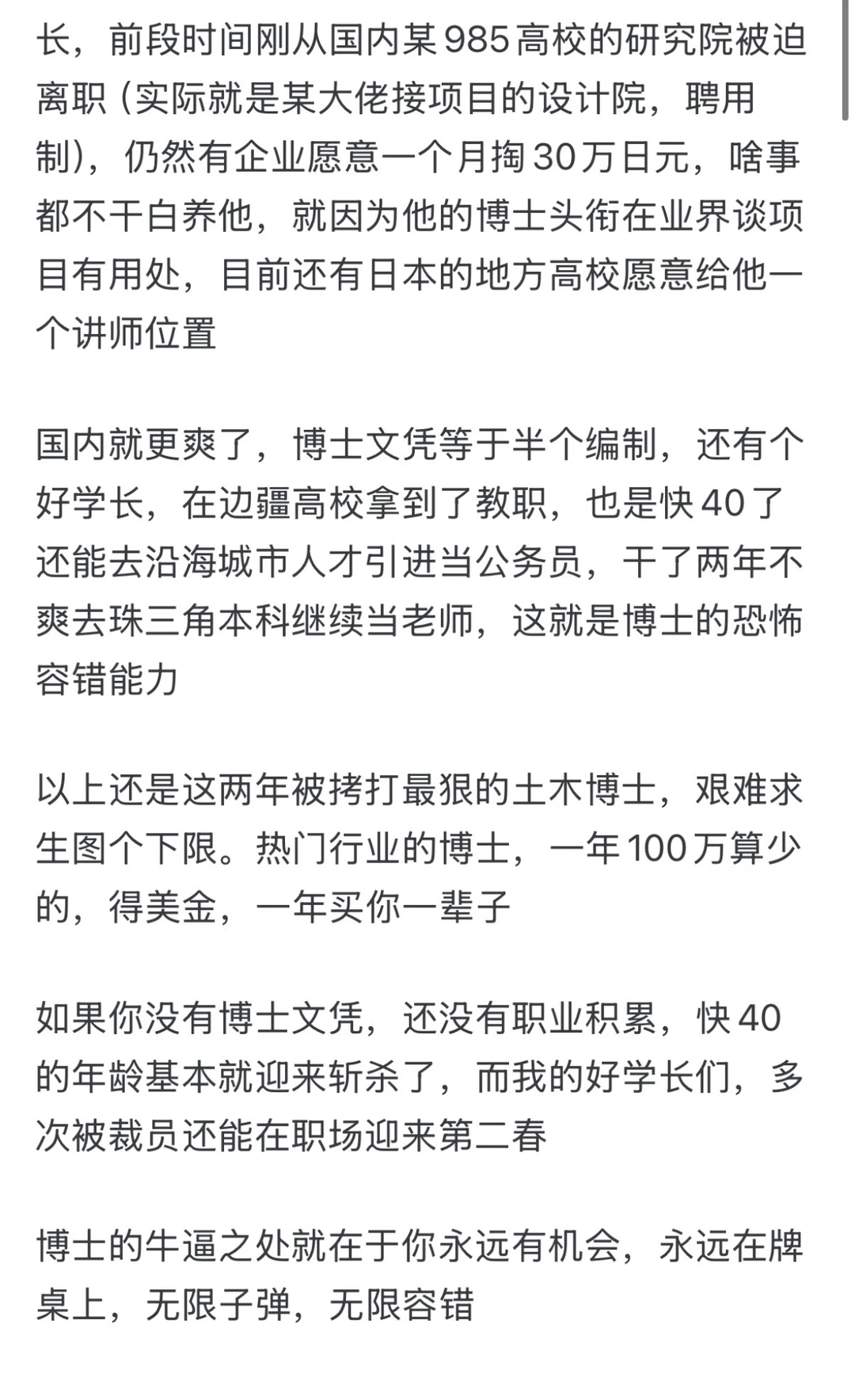 我有个学长,中日两边来回反复横跳,毕业10年换了78份工作,设计院施工单位总包都干不长,前段时间刚从国内某985高校的研究院被迫离职(实际就是某大佬接项目的设计院,聘用制),仍然有企业愿意一个月掏30万日元,啥事都不干白养他,就因为他的博士头衔在业界谈项目有用处,目前还有日本的地方高校愿意给他一个讲师位置